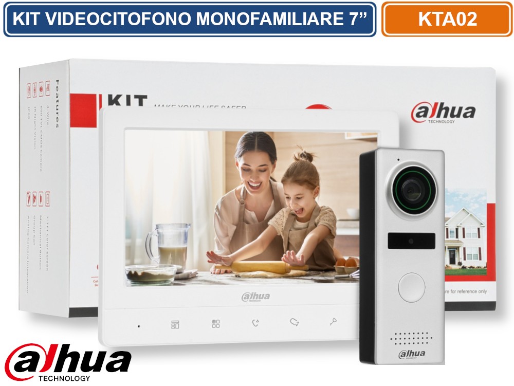 Kit citofono interno base a 4 fili Dahua - DHI-KTA02. Sistema citofono base con video e audio di grande valore. Usa il tuo attuale cavo a 4 fili per collegare questo sistema KIT monitor interno a 4 fili Dahua, schermo da 7 pollici Sblocco, videochiamata, regolazione del volume e monitoraggio della porta Schermo TFT da 7".