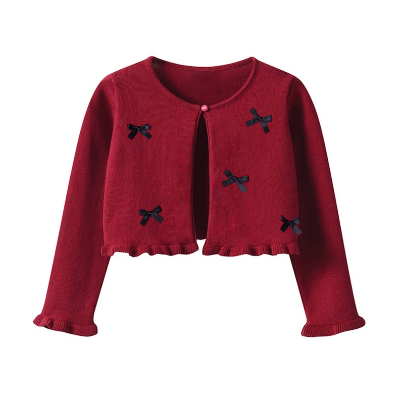 Long sleeve solid color bowknot embellished knit cardigan, sweet and sophisticated, making it a valuable addition to your child’s closet.
