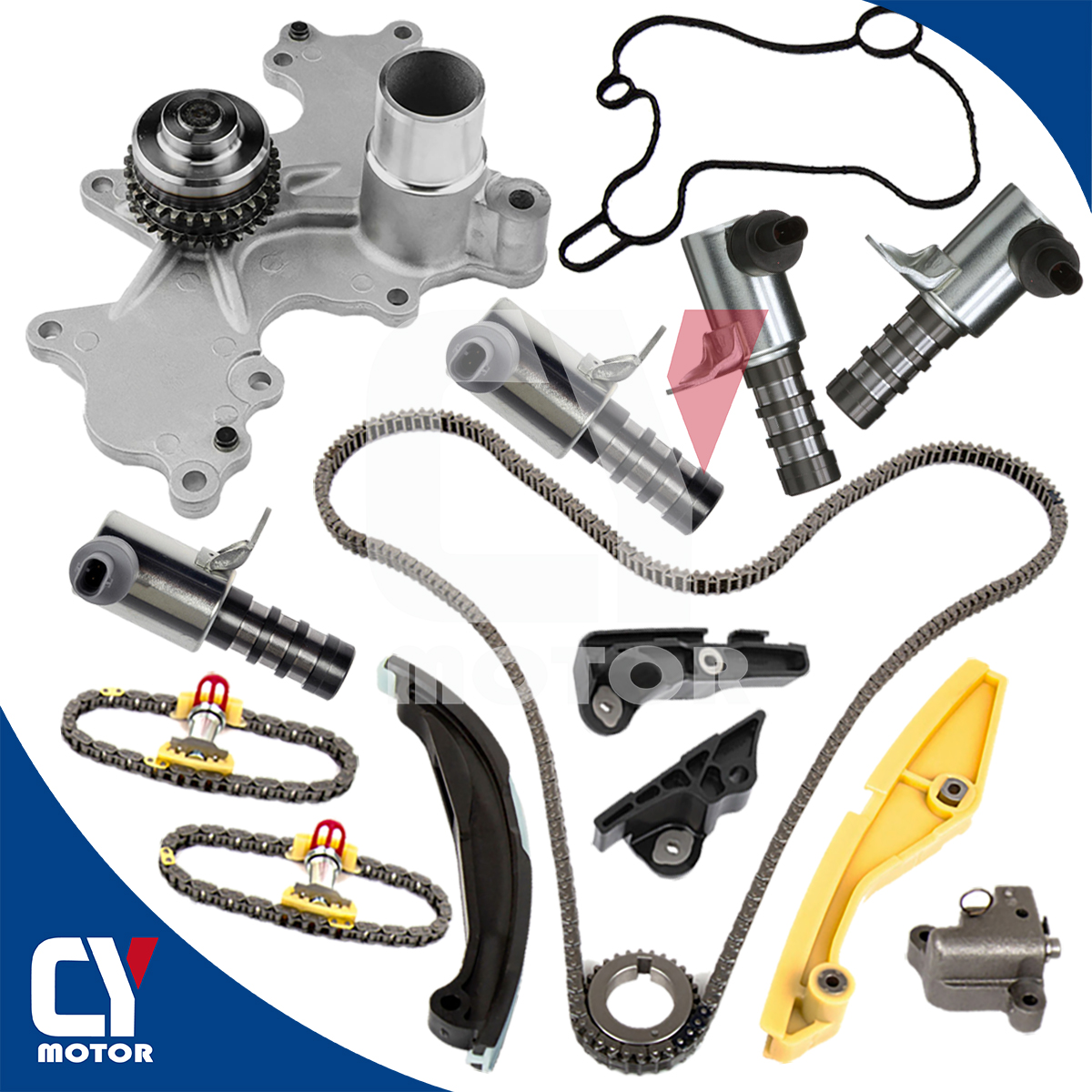 Timing Guide (Lower) X 1 PCSWater Pump Mounting Cover include Timing Chain Sprocket X 1 PCSVariable Valve Timing (VVT) Solenoid / Actuator X 2 PCSBlack Identification;Right Hand Intake Camshaft;Left Hand Exhaust CamshaftVariable Valve Timing (VVT) Solenoid / Actuator X 2 PCSGray Identification; Right Hand Exhaust Camshaft; Left Hand Intake Camshaft
