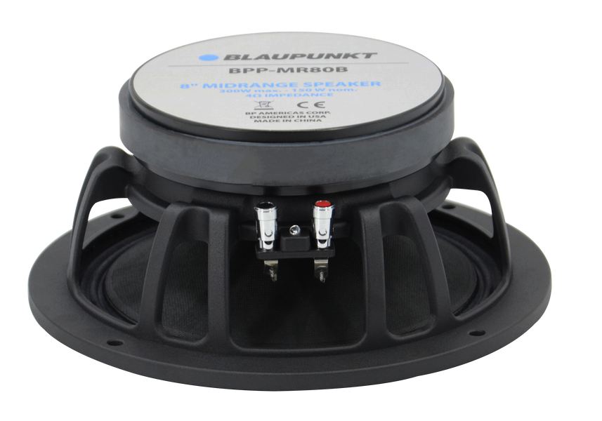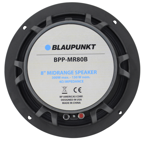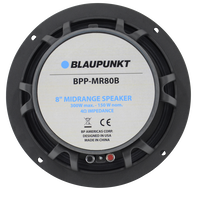 Blaupunkt BPP-MR80B 8 in. 300 watt 4 Ohm Mid Ranges Blaupunkt car audio and accessories, has premium products to customize your car just the way you like and enhance your driving experience. Accessories ranging from cutting edge and reliable audio systems to speakers, amplifiers, subwoofers, rear seat entertainment and the best car wiper blades. Specifications Size: 8 in. Nominal Impedance: 4 ohms Minimum Impedance: 3.6 ohms Continuous Power Handling: 300 W Nominal Power Handling: 150 W Frequency Response: 92Hz- 8.5KHz Sensitivity: 94dB Voice Coil Diameter: 38.6mm (1.5") Magnet: 30 oz Ferrite Weight: 7 lbs Ship Weight: 7.42 lbs.