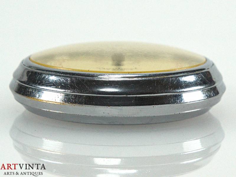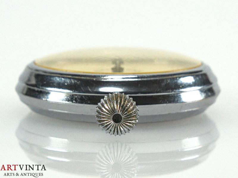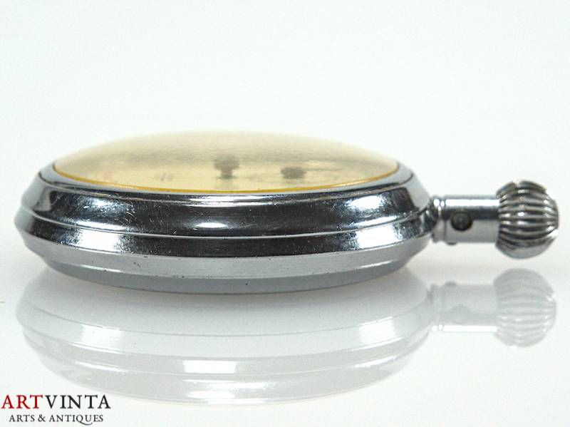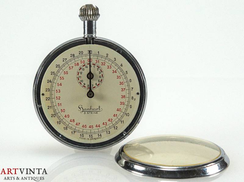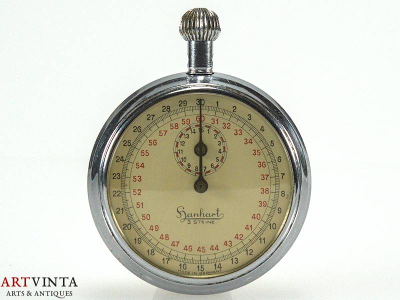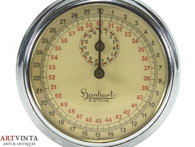 Stopwatch from the Hanhart manufactory, made in Germany. Round metal body without decoration. Start-stop function. One pusher. Beige-colored dial with Arabic numerals. 60-second dial with 30-minute sub-dial. Mechanism with seven jewels. The watch is damaged. It runs, but the bolt is broken off and the crown is jammed. Age-related condition.