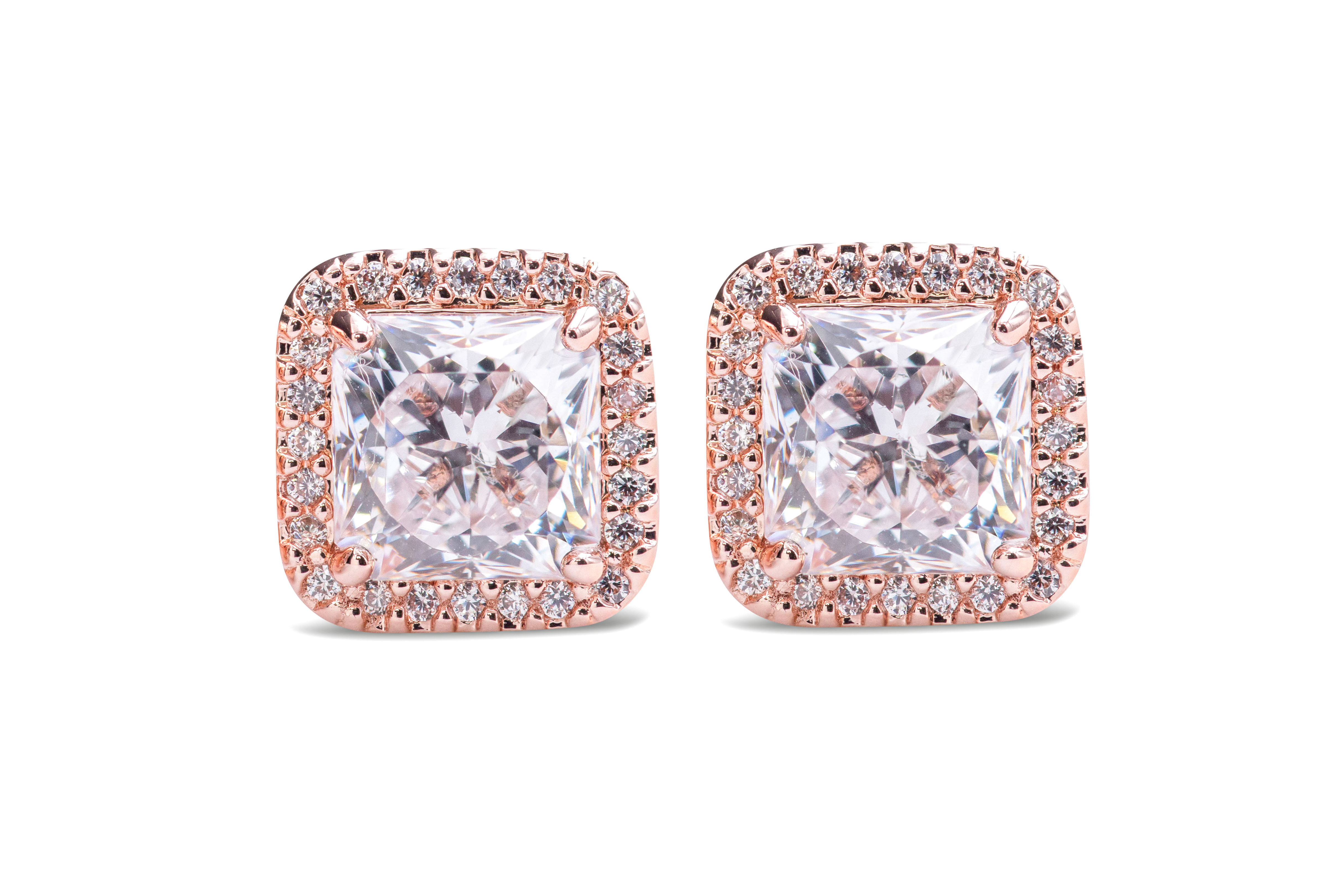Classic styles are staples in any wardrobe and for good reason. These elegant and timeless square stone stud earrings in Pandora Rose are the perfect addition to your collection that you can wear all year round. The studs are framed with smaller cubic zirconia that catch the light from every angle adding extra shine to your look. The Pandora Rose unique metal blend is plated with 14k rose gold for a warm glow and the butterfly back earring backs are made from 14k rose gold-plated sterling silver.