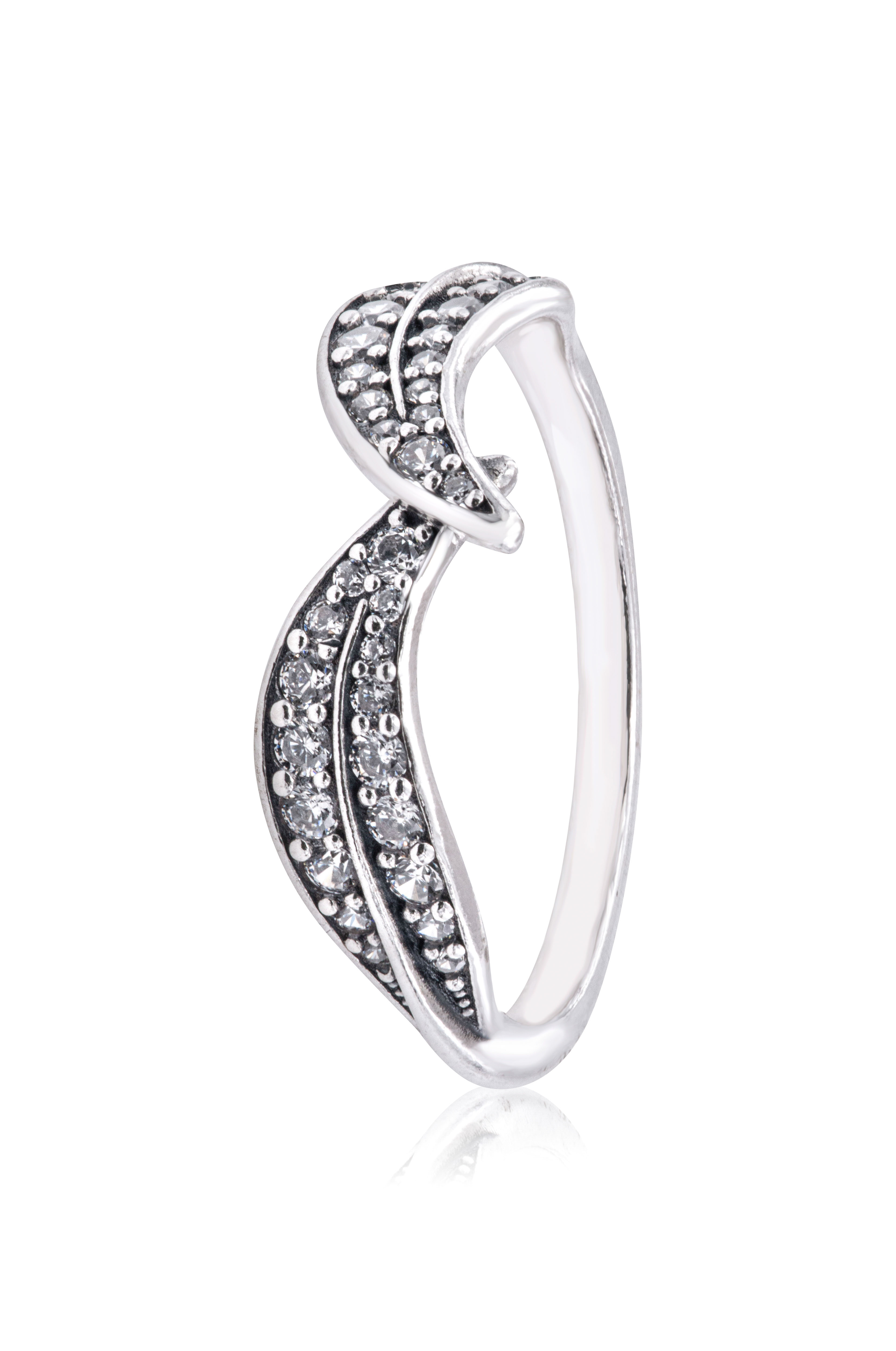 Wear a sparkling tribute to nature with the Sparkling Leaves Ring. Hand-finished in sterling silver this ring features two leaves facing each other. The leaves are embellished with rows of brilliant-cut clear cubic zirconia pave. With their subtly curved silhouette and slightly crossing tips the leaves have a fluid elegance that will upgrade any look. If you love nature and also love sparkling style this leaves ring is perfect for you.
