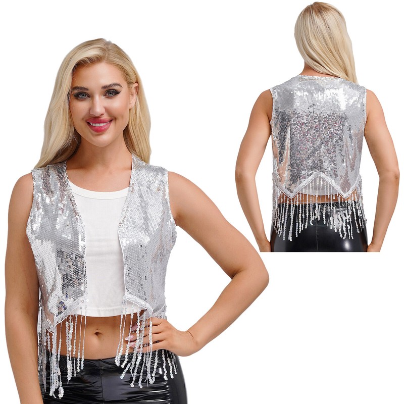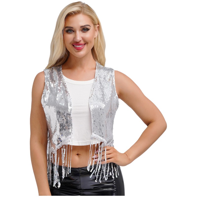 Designed with open front, sleeveless, jagged trims, sequined fringe, fully lining and crop length, the vest makes women very stunning.