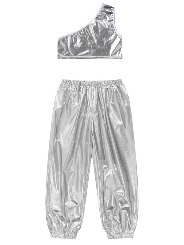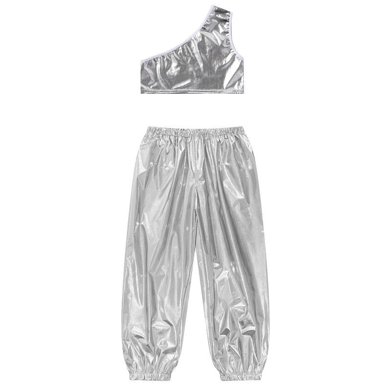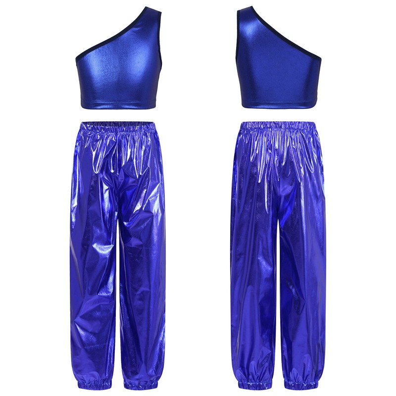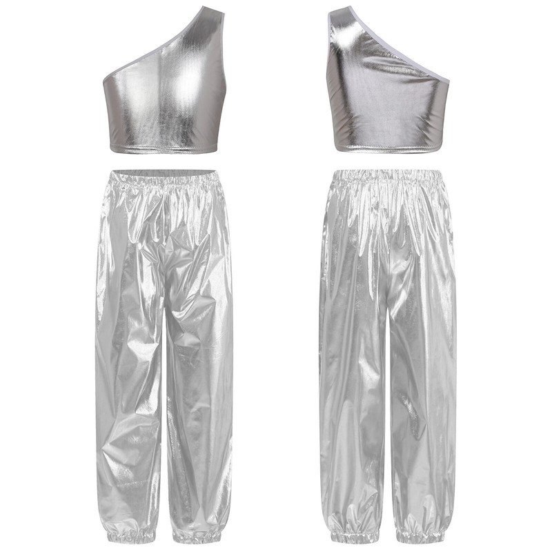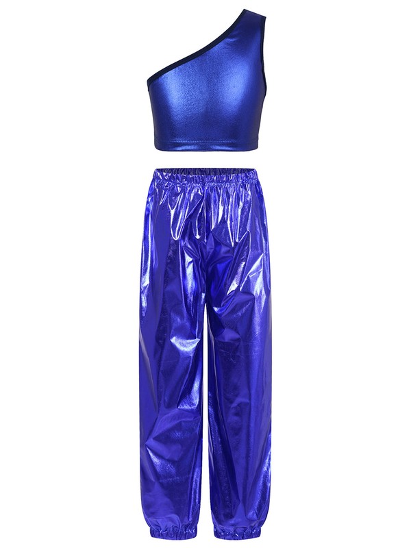 Single shoulder vest, slant shoulder, shiny metallic fabric, makes kids catch more eyes.