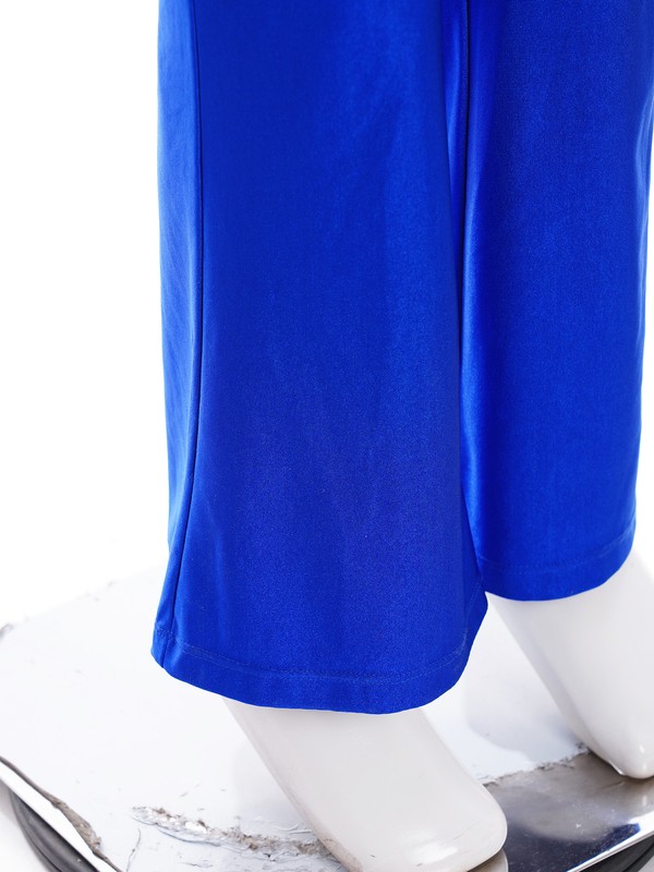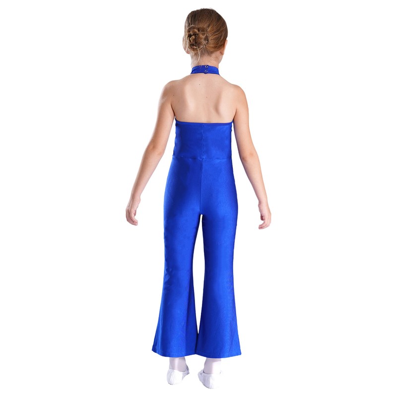 Halter sleeveless backless jumpsuit with press buttons for easy wearing. Bell-bottom design better lengthen the leg proportion visually.
