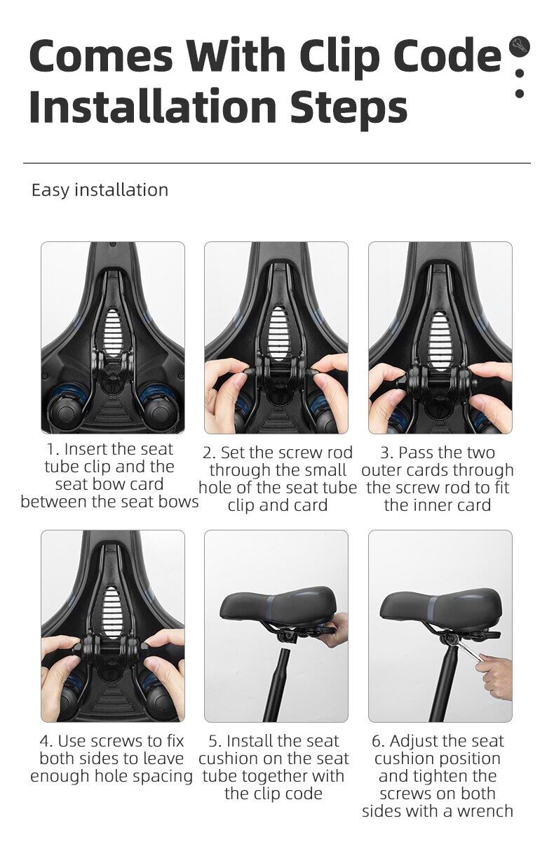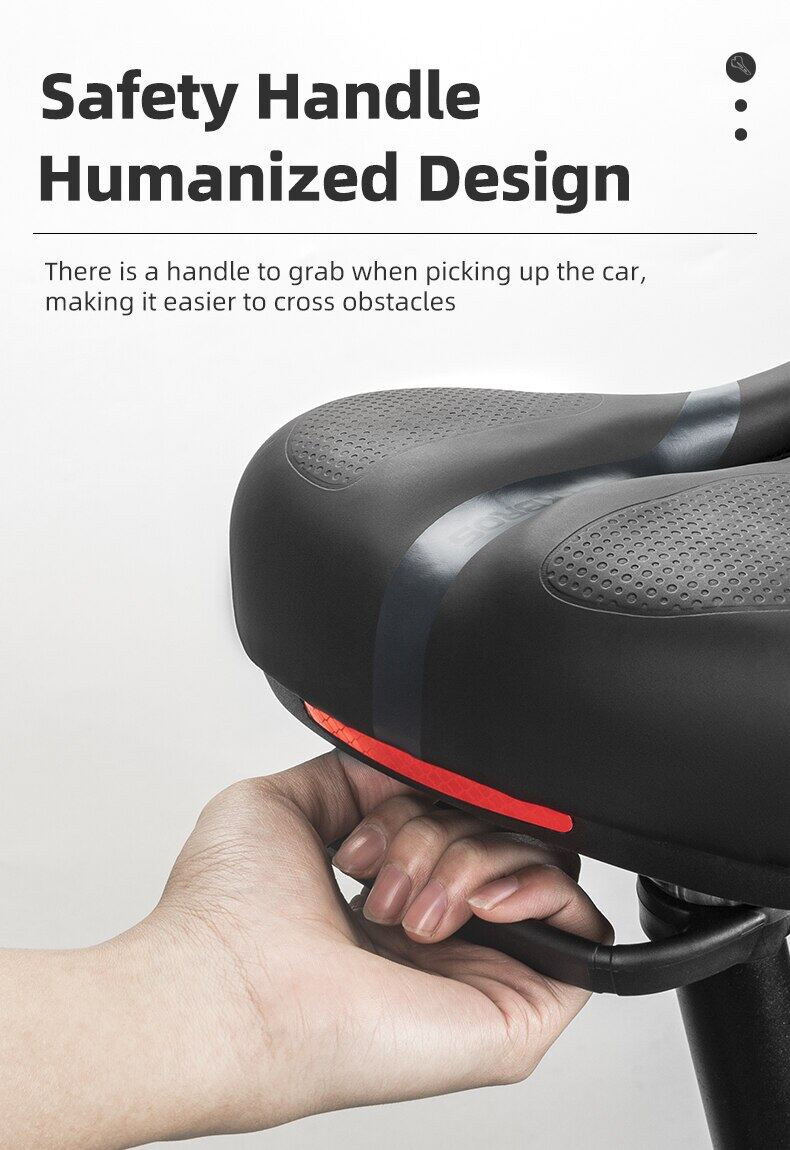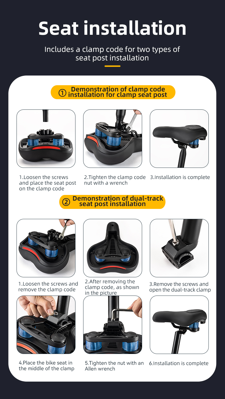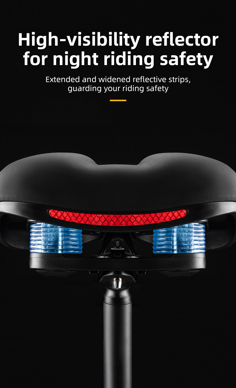 1.Hollow design breathable,reduced sweating and comfortable cycling 5.There is a handle to grab when picking up the car, making it easier to cross obstacles 6.PU leather surface, waterproof & dustproof,clean and 7.Bottom spherical shock absorption design,large buffer force and effective shock absorption 8.Lengthened and widened reflective strips to protect cycling safety 9.Streamlined design reduces cycling stress 10. Built-in filled polyurethane high-density foam can effectively absorb road vibration and make cycling comfortable (silicone model with liquid silicone, better shock absorption) 11.Rounded Back Seat More Comfortable, effectively disperse the pressure on the buttocks and make cycling more comfortable 12.Easy installation