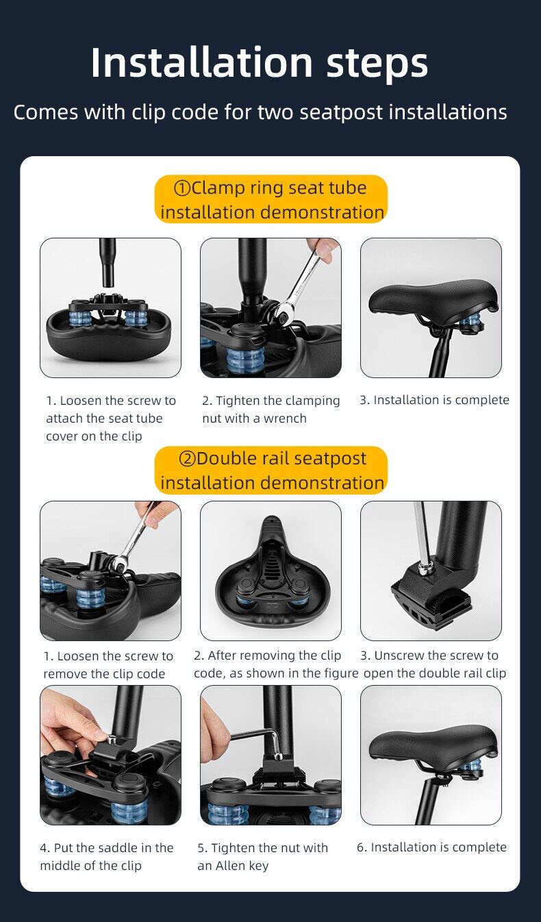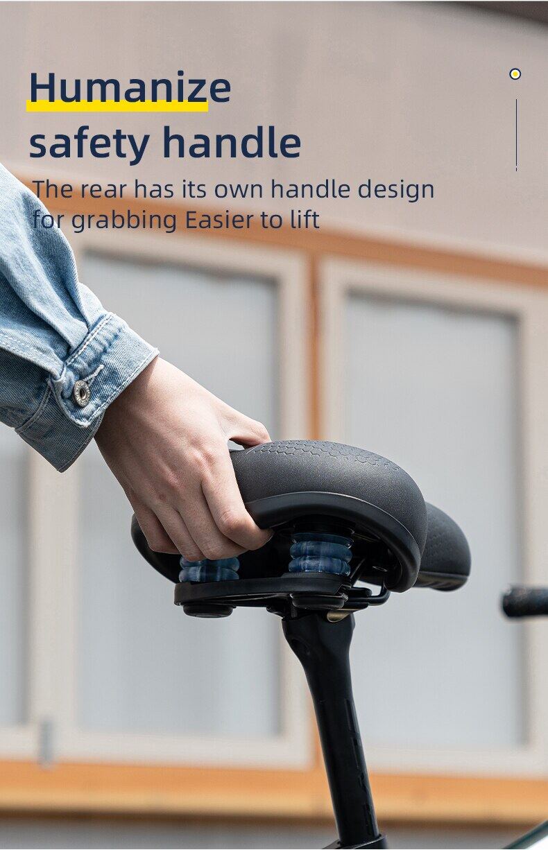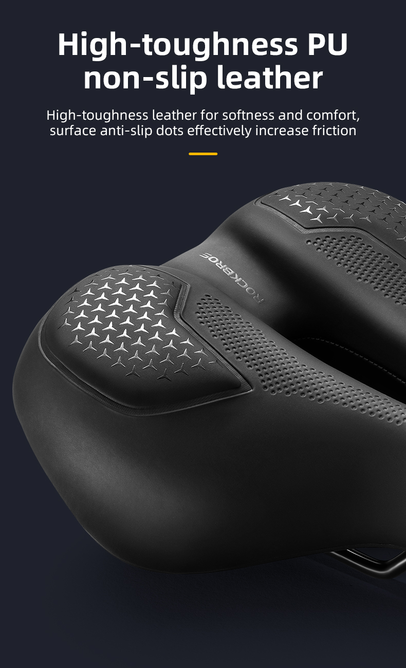 1.Hollow design breathable,reduced sweating and comfortable cycling 5.There is a handle to grab when picking up the car, making it easier to cross obstacles 6.PU leather surface, waterproof & dustproof,clean and 7.Bottom spherical shock absorption design,large buffer force and effective shock absorption 8.Lengthened and widened reflective strips to protect cycling safety 9.Streamlined design reduces cycling stress 10. Built-in filled polyurethane high-density foam can effectively absorb road vibration and make cycling comfortable (silicone model with liquid silicone, better shock absorption) 11.Rounded Back Seat More Comfortable, effectively disperse the pressure on the buttocks and make cycling more comfortable 12.Easy installation