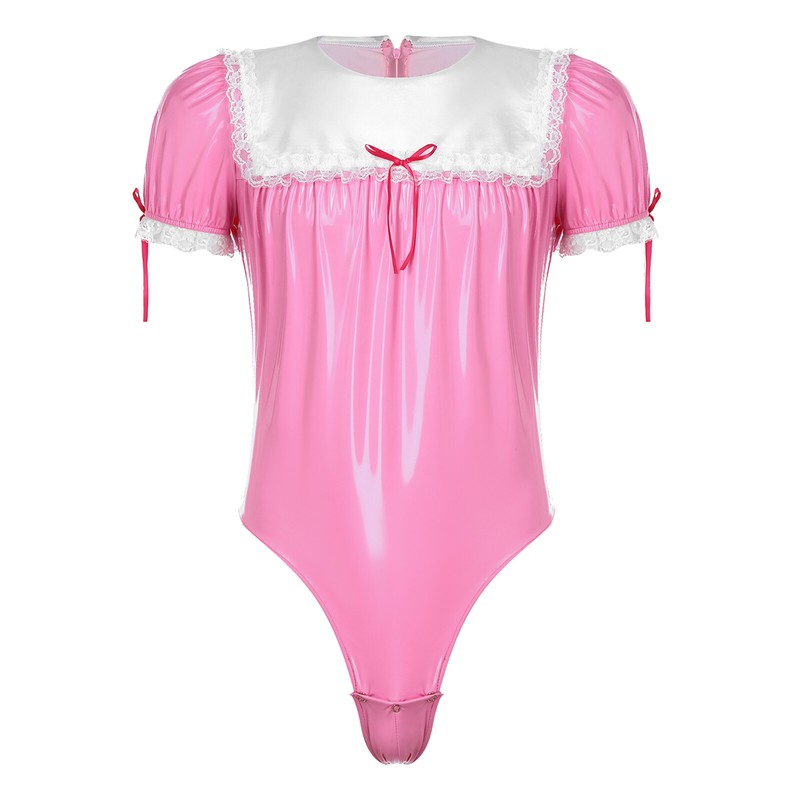Patent leather bodysuit for men, puff sleeve, satin sailor collar, lace trim at cuffs and neckline, bowknots decoration.