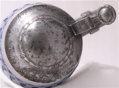 The lid is pewter, designed in the same Jugendstil manner with a wreath around the lid and on top of the thumblift. It is engraved with a presentation inscription stating it was given as a gift to someone on his 25th anniversary of becoming a priest by his former student friends.
