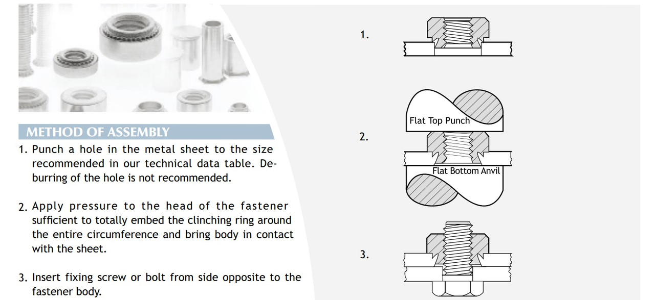 Clinch fasteners are used in conjunction with stamped or fabricated metal assemblies. They are used extensively in both automotive and non-automotive applications They are captive-style fasteners that – upon installation – become a permanent part of the mating assembly.