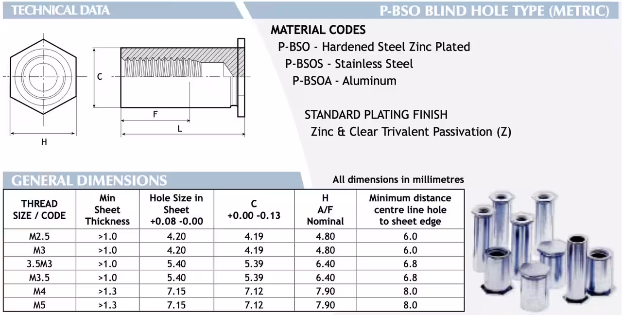 Various clinch fastener designs are available. Popular options include traditional self-clinching fasteners and Anchor® Rivet Bushes.