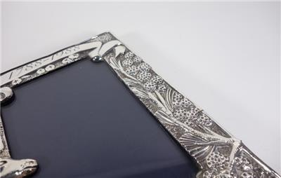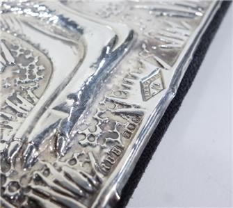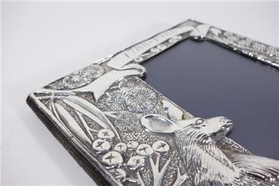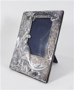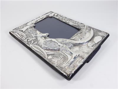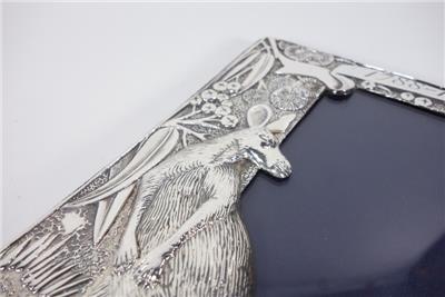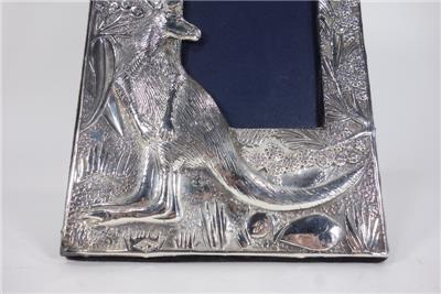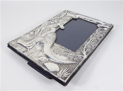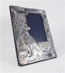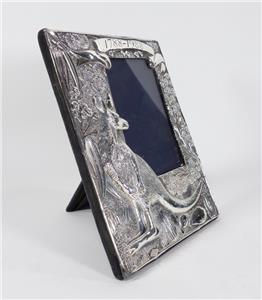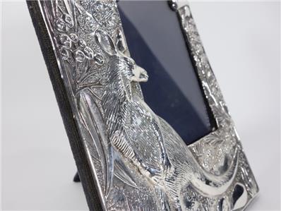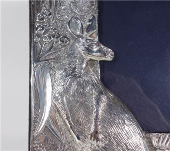 This stunning vintage Australian sterling silver picture frame from the 1988 bicentenary features a beautiful repousse design of kangaroos, gumnuts, and gumleaves in high relief textured detail.