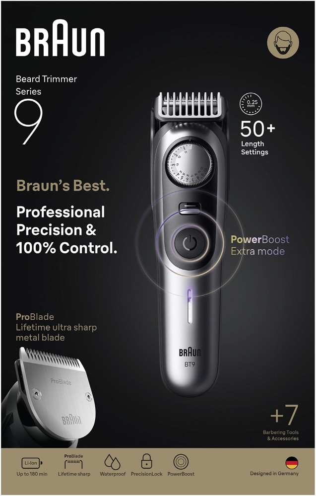 Der Barttrimmer von Braun, wurde entworfen für professionelle Präzision und maximale Effizienz. Der PowerBoost-Extramodus hilft dir, selbst die dichtesten Bärte zu bewältigen, während die AutoSense-Technologie bei jedem Zug eine makellose Gleichmäßigkeit gewährleistet. Die ultrascharfe ProBlade Klinge erfasst schwierige Haare. Das Präzisionsrad mit Verreigelung bietet 52 Längeneinstellungen in 0,25 mm Schritten für ultimative Kontrolle. Dieser Premium-Trimmer bietet eine vielseitige Auswahl an Werkzeugen zum Trimmen, Rasieren, Konturieren und Detailarbeiten, die es dir ermöglichen, perfekte Linien, Übergänge und Abschlüsse zu erzielen. Lieferumfang: 1 Barttrimmer 2 Kammaufsätze 2 Aufsätze 1 Bartschablone 1 Reise-Etui 1 Reinigungsbürste.