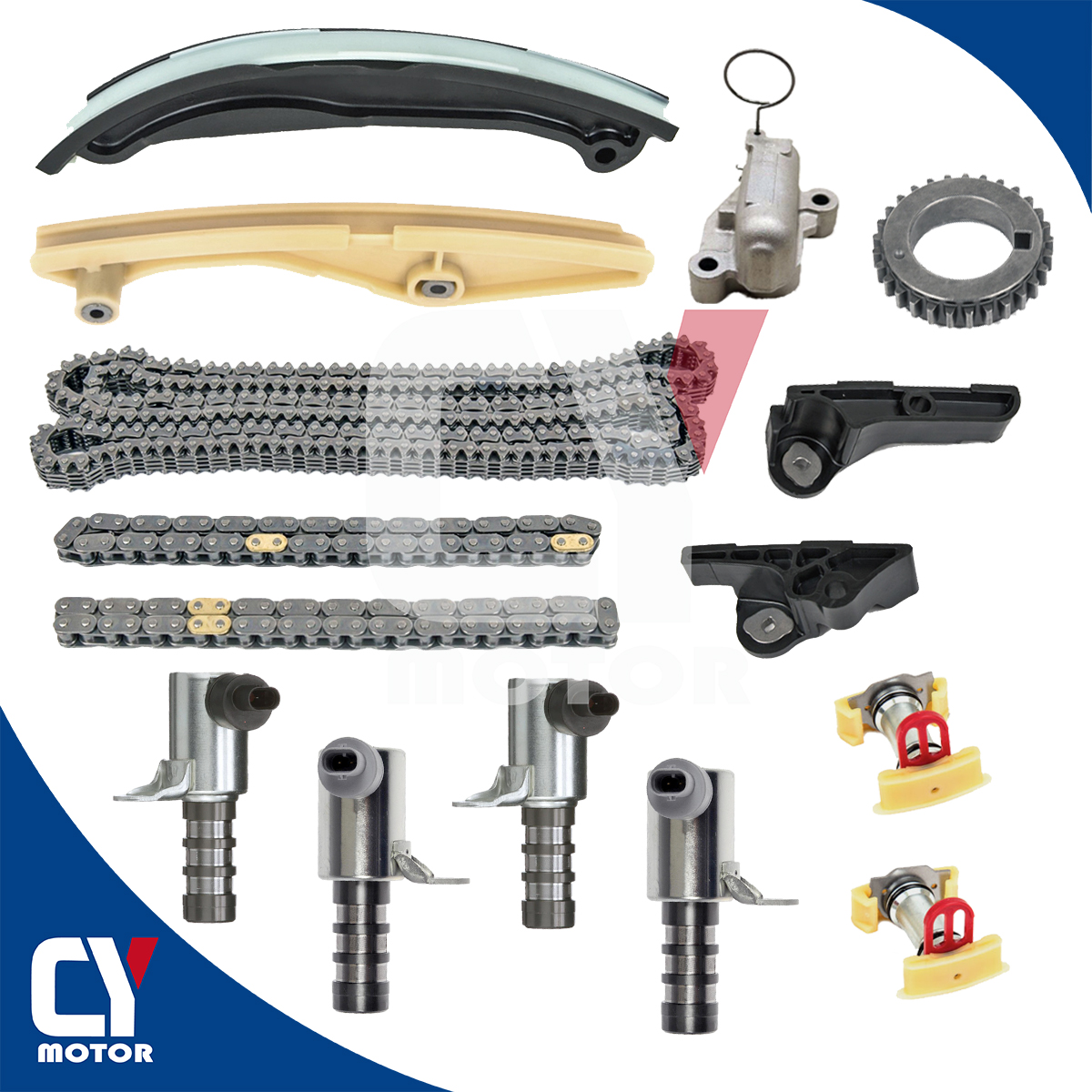 Cadena De Distribución / Primary Timing Chain (254 Link - Silent Type) x 1 PCSCadena De Distribución / Secondary Timing Chain (50 Link - Roller Type) x 2 PCSEngrane De / Rueda De Espigas / Crankshaft Gear (29 Teeth) x1 PCSTensor / Secondary Timing Chain Tensioner x 2 PCSTensor / Primary Timing Chain Tensioner x1 PCSGuía / Timing Guide (Lower, Left) x 1 PCSGuía / Timing Guide (Lower, Right) x1 PCSGuía / Timing Guide (Upper) x1 PCSGuía / Timing Guide (Lower) x1 PCSVariable Valve Timing (VVT) Solenoid / Actuator x 2 PCSBlack Identification;Right Hand Intake Camshaft;Left Hand Exhaust CamshaftVariable Valve Timing (VVT) Solenoid / Actuator x 2 PCSGray Identification; Right Hand Exhaust Camshaft; Left Hand Intake Camshaft