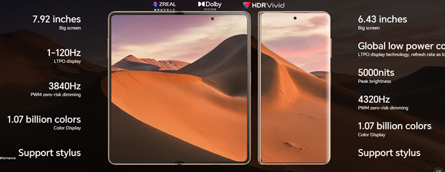 | Cover display: LTPO OLED, 1B colors, 120Hz, HDR10+, 2500 nits 6.43 inches, 1060 x 2376 pixels, 402 ppi, nanocrystal glass 2.0 |