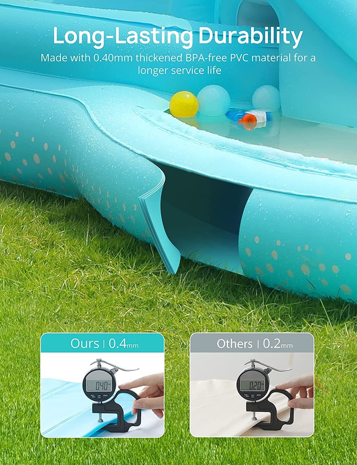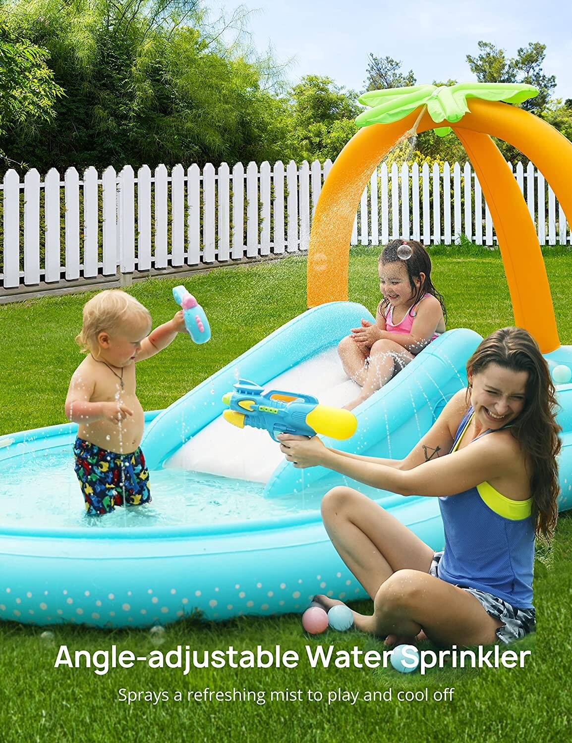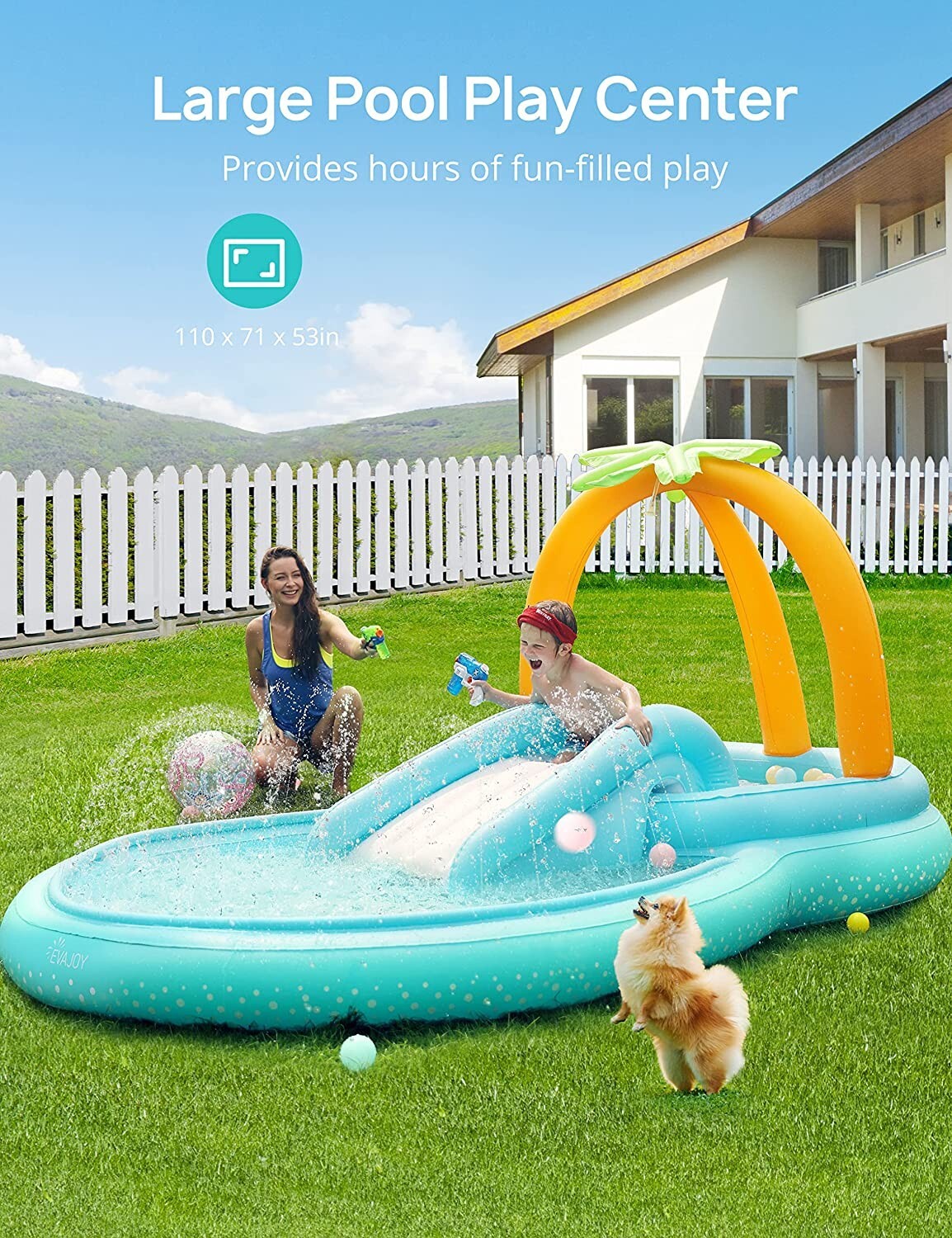 Turn your backyard into your family’s private water park with the EVAJOY inflatable play center. Built of puncture-resistant PVC, this wading pool with slide and water sprays for kids withstands rough and tumble play for your children to enjoy summer after summer.