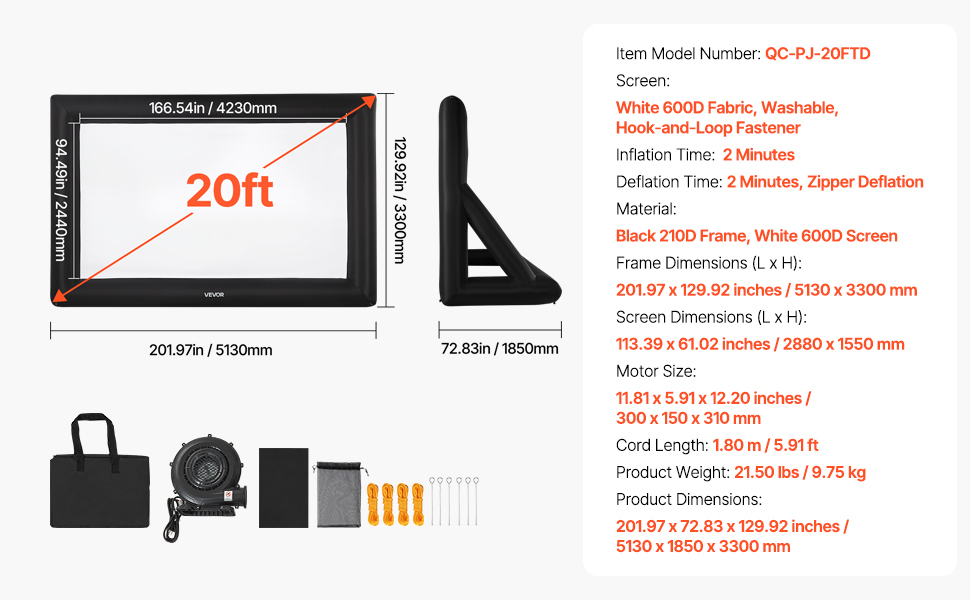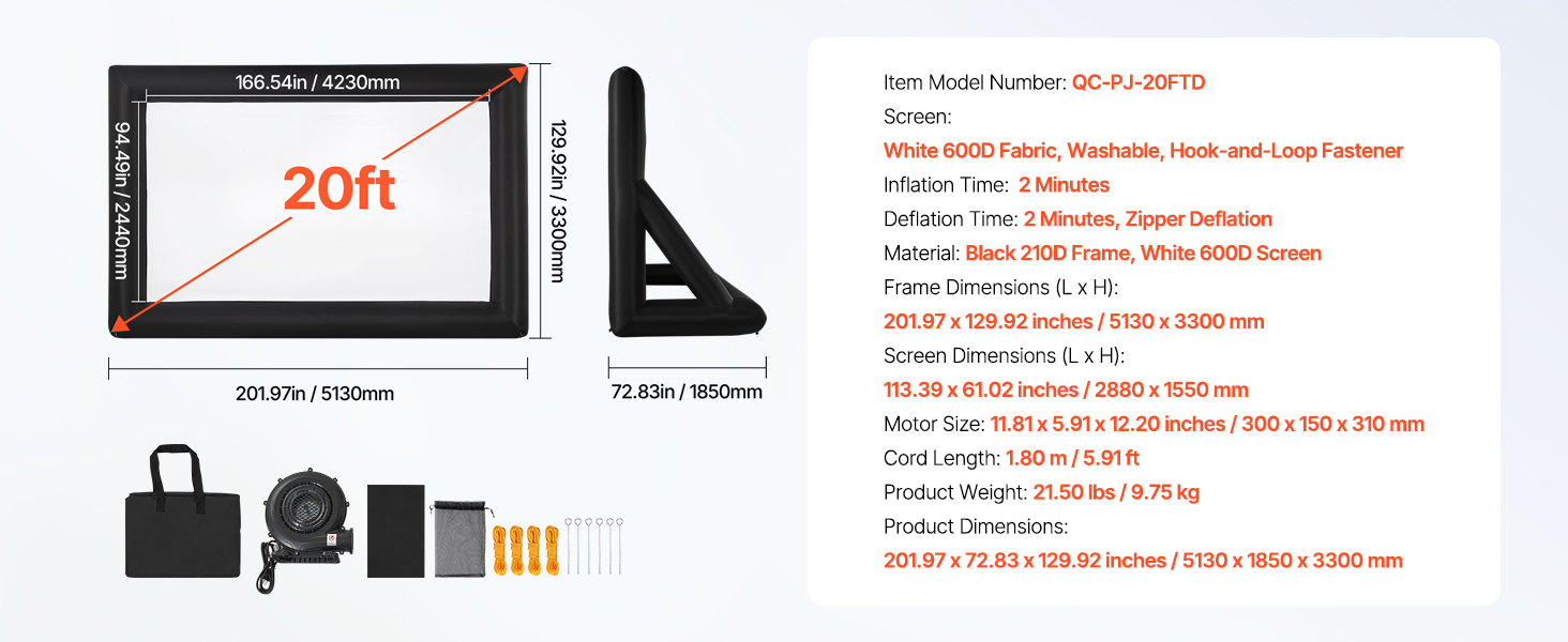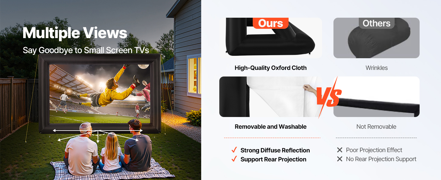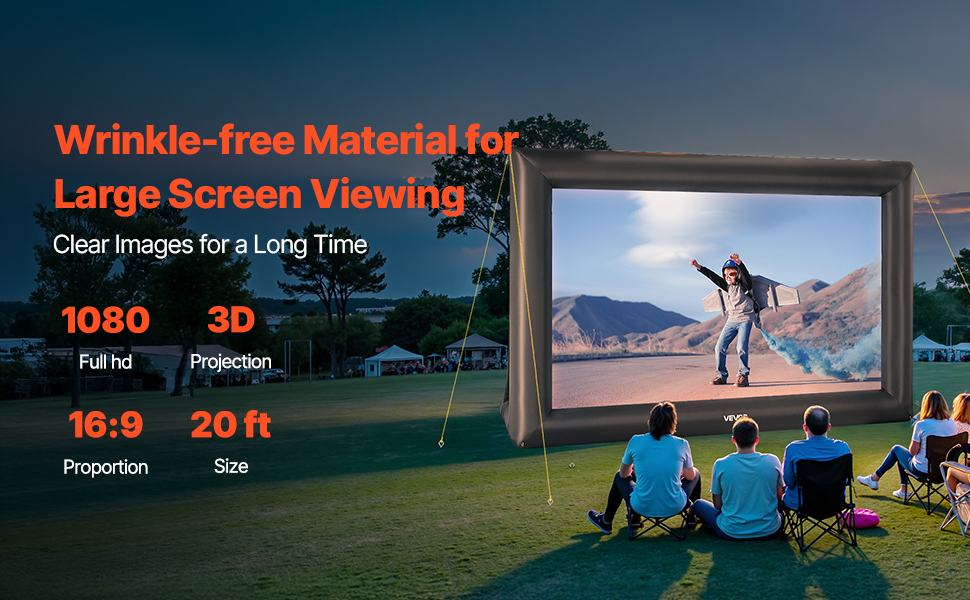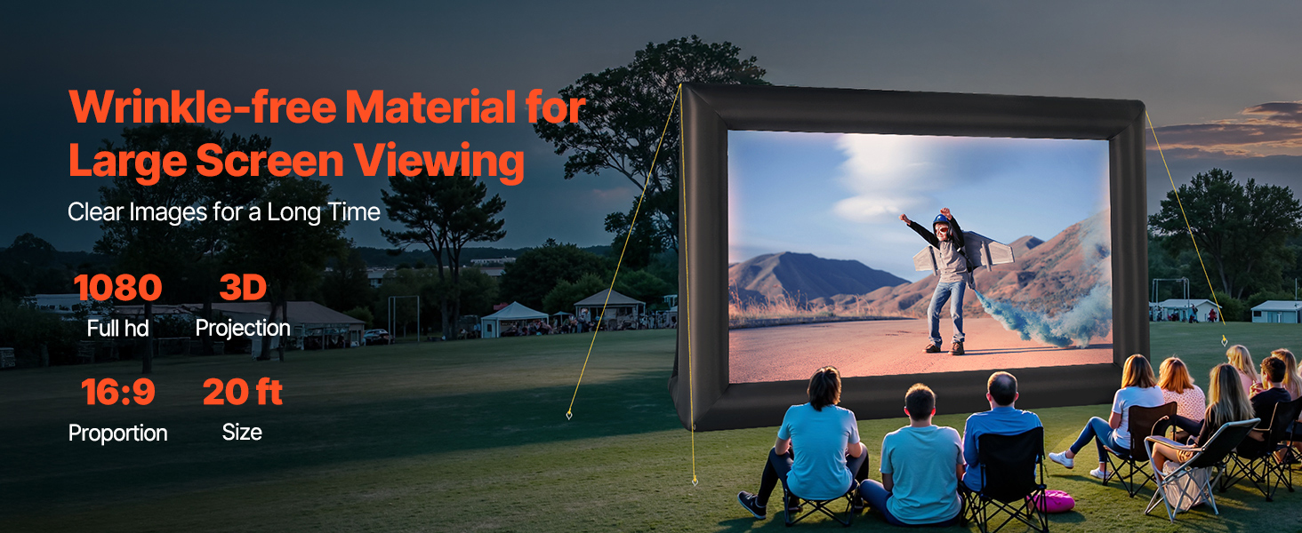 High-quality Material: This inflatable projector screen for outside uses high-quality Oxford fabric, which can resist creases and is easy to clean, ensuring clear, high-resolution images every time. The screen size is 13.87 x 7.87 ft. Front and rear projection are available with an aspect ratio of 16:9
