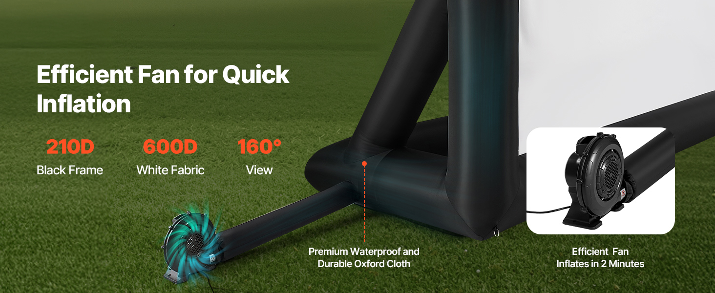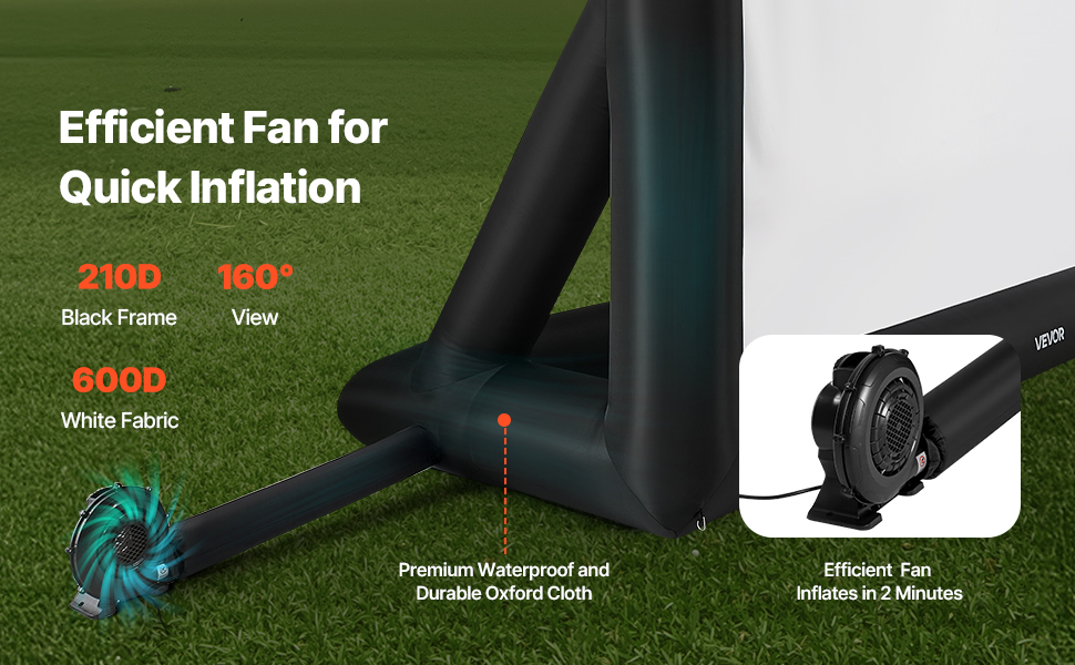 Instant Setup: Our inflatable projector screen is equipped with an efficient, 250W low-noise blower that can inflate the screen in just two minutes, saving you valuable time. The low-noise design won't disrupt your peaceful movie nights with family or neighbors.