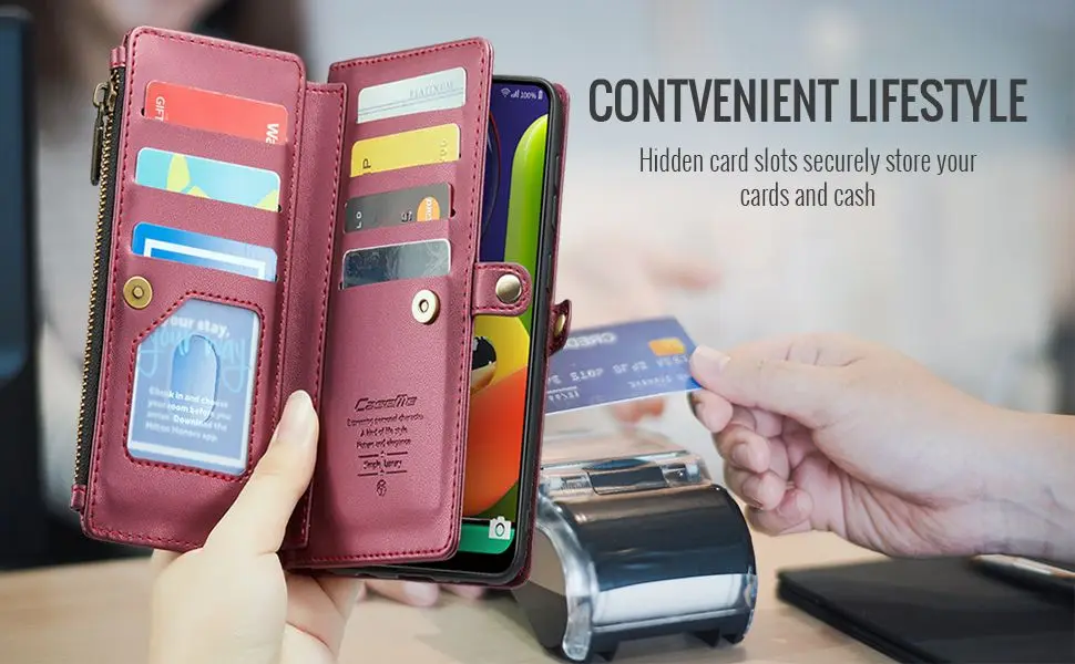 4. [Card Slots, Zipper and Bracelet]: This wallet case includes 7 card holders + 1 zipper bag + 1 cash slot, easily store your ID, credit cards, driver's license, bills, coins and some cash. The zipper has been tested over 5,000 times; with a removable strap providing an additional grip method.