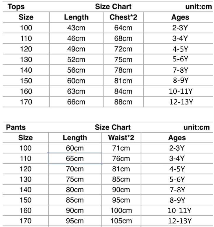 1.There is 1-2cm size deviation due to manual measurement. 1 inch = 2.54 cm 2. Suggest age and height is only for your reference. Please choose the size by your kids body measurement and check the measurement chart carefully before you buy the item. If your kids body measurement is between 2 sizes, suggest to choose the larger size. 3. Please note that slight color difference should be acceptable due to the light and screen.