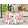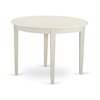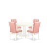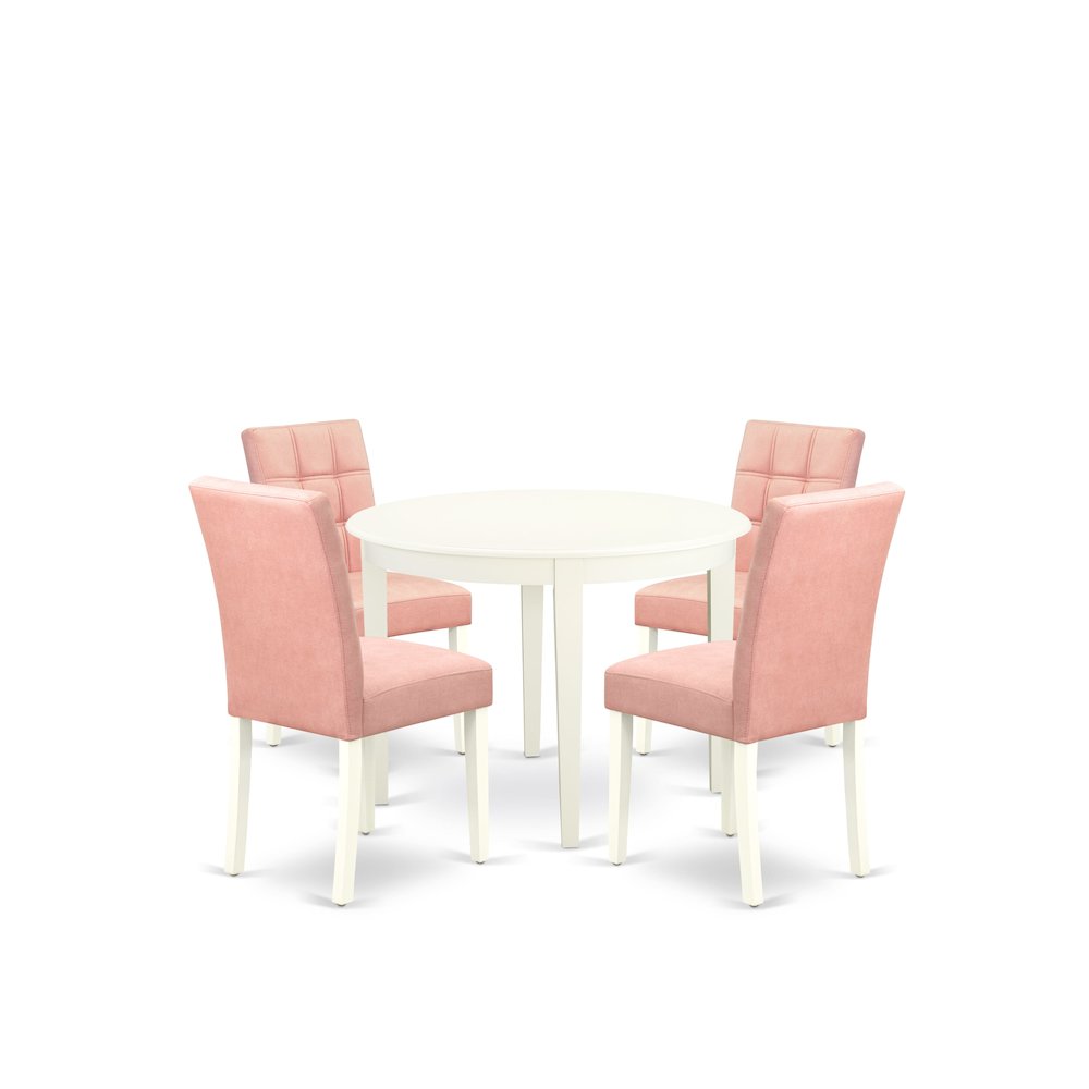 EAST WEST FURNITURE - BOAS5-WHI-42 - 5-PIECE DINING ROOM SET The 5-piece kitchen table set effortlessly combines style, functionality, and comfort to enhance The overall ambiance of your dining room. it Includes a round table supported by 4 sturdy legs and 4 dining chairs, all meticulously crafted to elevate your dining experience. This dining table set seamlessly blends classic and modern design elements, featuring a Linen White round tabletop that beautifully complements its matching Linen White wooden legs. The dining room chairs, made from high-quality rubberwood, come with Beige Red faux Leather upholstery and coordinating Linen White wooden legs, ensuring exceptional durability for daily use due to Their inherent strength and resistance to wear and tear. The kitchen chairs feature easy-to-clean faux Leather seats and stylish chair backs, providing added convenience, especially for families. Assembling and maintaining These pieces is a straightforward task, and regular furniture cleaners will help preserve Their impeccable appearance. This compact dining table set consistently creates a fresh and welcoming atmosphere, making it an excellent addition to your dining area. PRODUCT FEATURES: • Frame Material: Rubber Wood • Fabric Type: Faux Leather • Table Top Style: Round • Chairs Back Style: Stylish Back • Table Color: Linen White • Chair Color: Beige Red • Table Dimension: Length: 42; Width: 42; Height: 30 • Chairs Dimensions: Length: 18.05; Width: 15.75; Height: 36.25. Included in The Package: 4 Kitchen Chairs and a Kitchen Table.