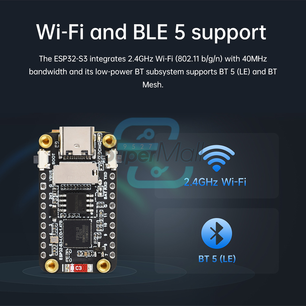 2.4GHz Wi-Fi (802.11 b/g/n) and Bluetooth 5 (LE) support with onboard antenna