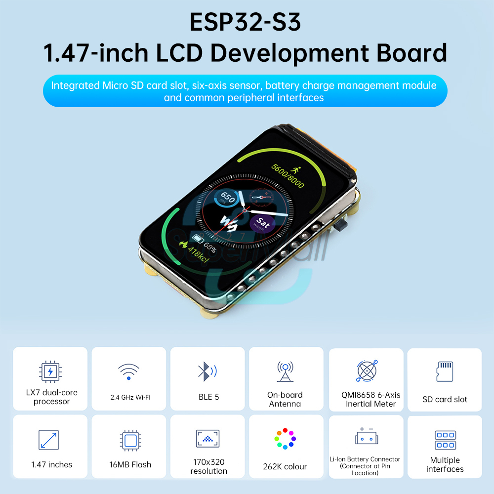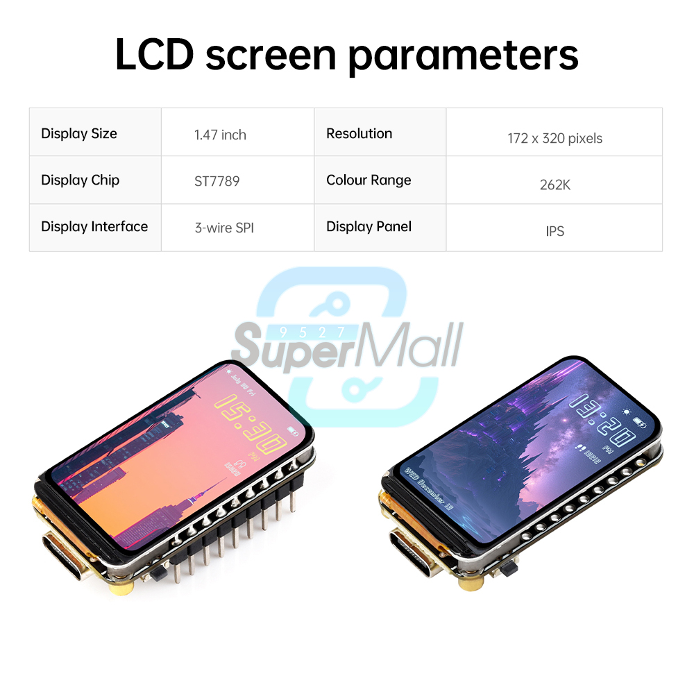 1.47-inch LCD screen with 17.7-inch LCD screen, and 16MB Flash onboard. 1.47-inch LCD screen, 172 x 320 resolution, 262K color