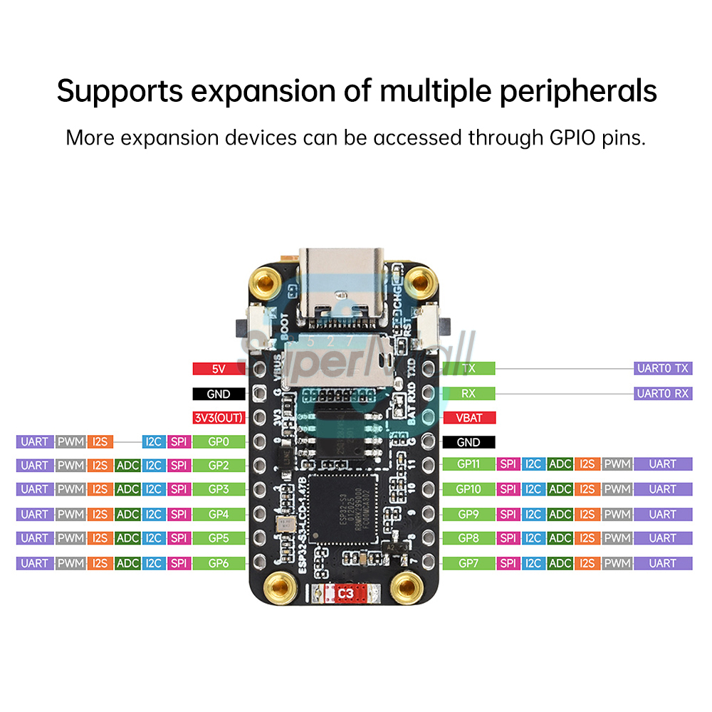 5. Large-capacity storage combination, including 8MB PSRAM, 16MB Flash, to meet the diverse development needs.