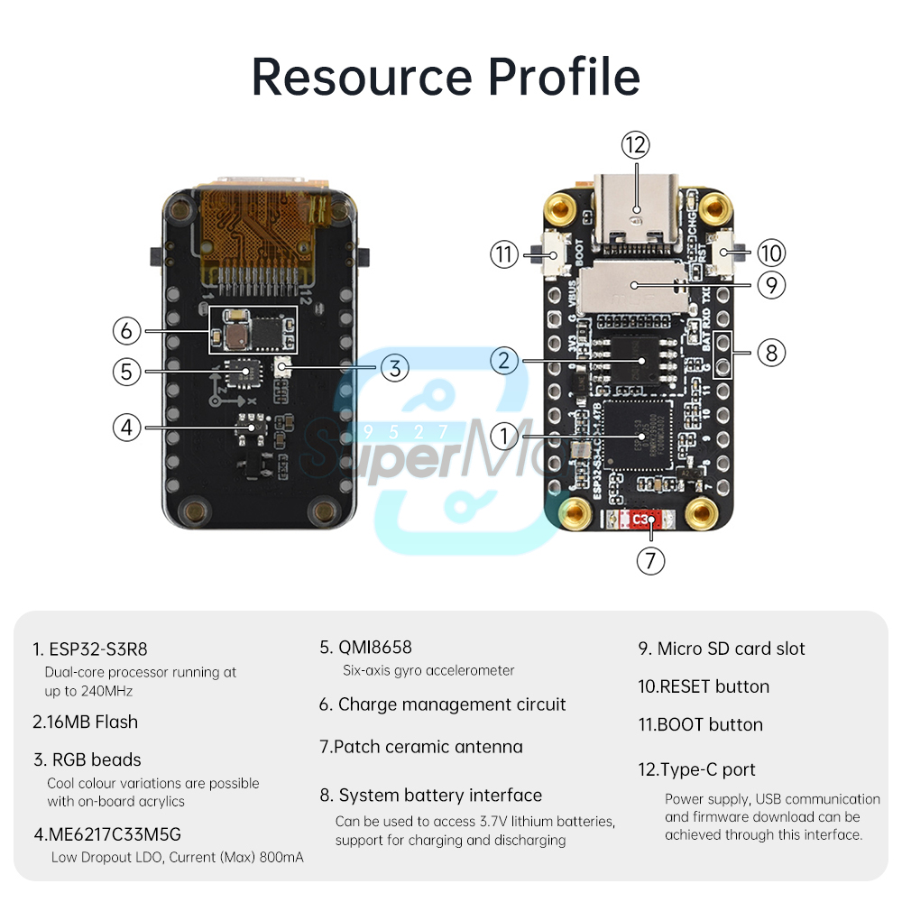 4. Onboard QMI8658 6-axis IMU sensor, support device status detection and pedometer function.