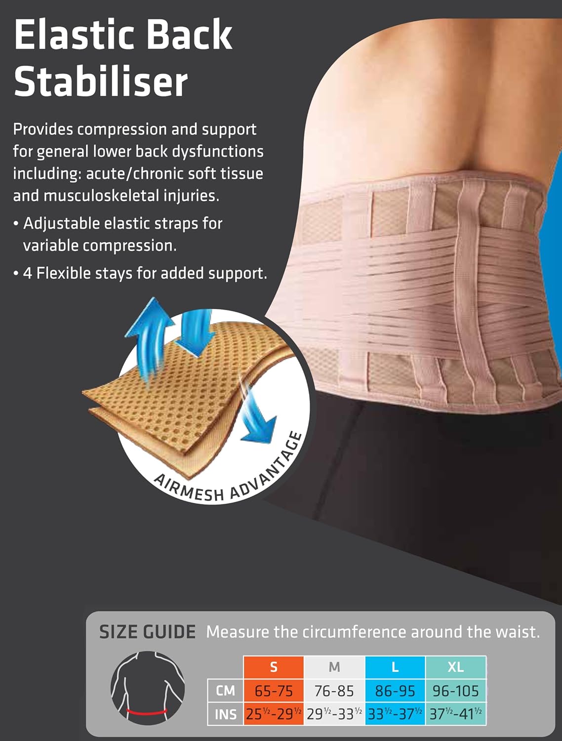 Four built-in flexible stabilizers in the lumbar area for added support