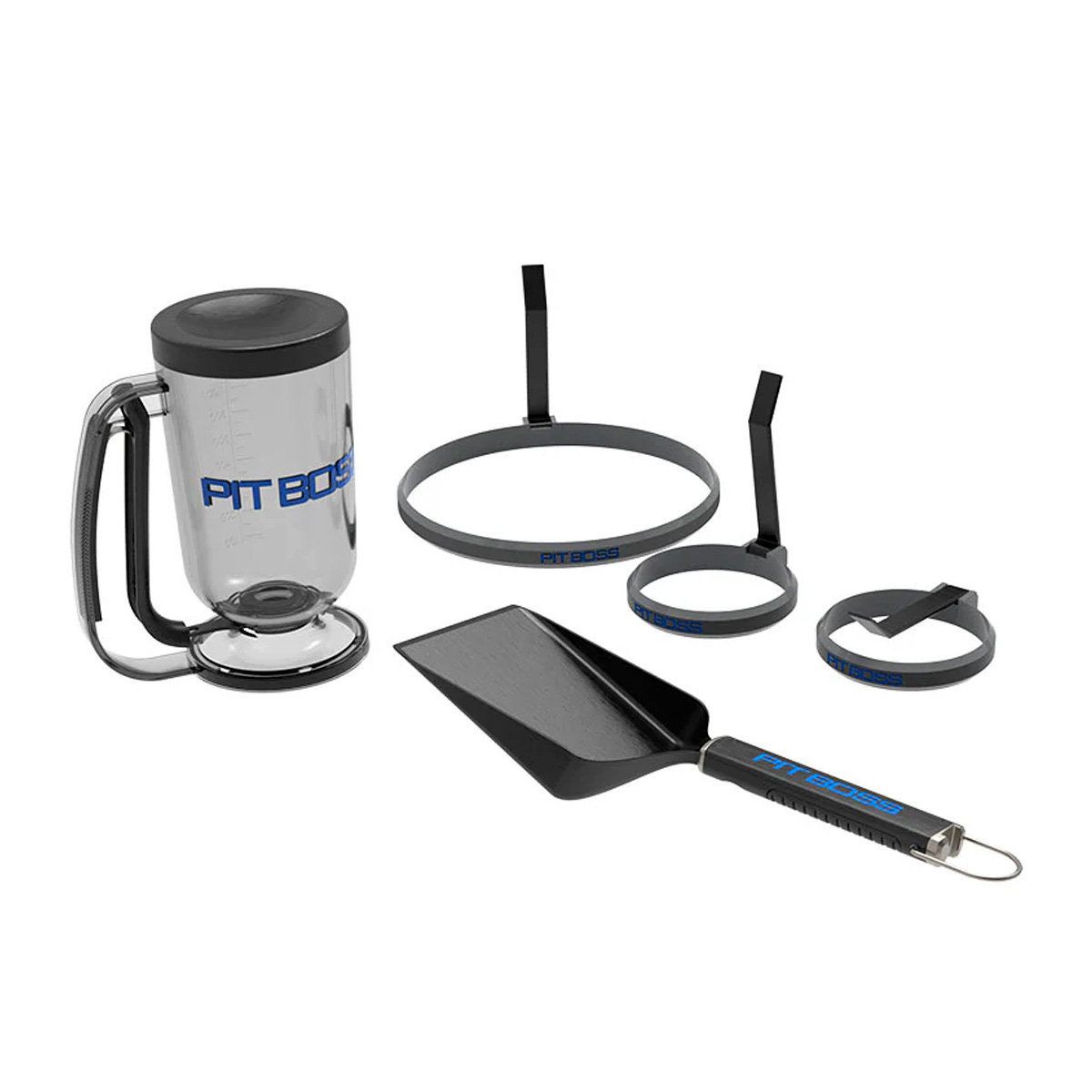 Make mornings easier and more delicious with the Pit Boss Ultimate Griddle Breakfast Kit. This kit includes a pancake dispenser, two egg molds, an omelet mold, and a versatile griddle grub shovel with a built-in bottle opener. Designed to give you perfect eggs and pancakes every time, these tools will quickly become your go-to for breakfast and beyond. Made from durable materials like nylon polymer, plastic, stainless steel, and silicone, this set is built to last and handle all your breakfast-making needs.