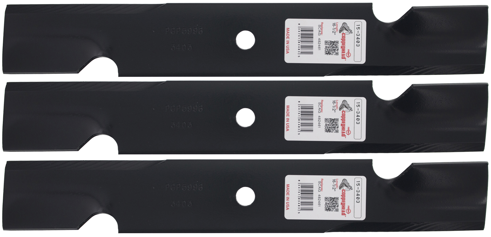 Three (3) pack of Rotary® 3403 replacement lawn mower blades for Bad Boy, Great Dane, John Deere, Lesco, Scag, Snapper, Toro, and Wright Mfg. mowers. Requires two (2) blades for 32-inch decks or three (3) blades for 48-inch decks. Fits OEMs: 038-5350-00, D18086, GDU10230, TCU37209, 021871, 050111, 21871, 5011, 501121871, 48110, 481706, 481710, 48184, 482461, 482877, A-48110, A48110, A48184, 1-7043, 2-9247, 7017043, 7017043YP, 7075771, 7075771BMA, 7075771BZ, 7075771BZYP, 75771, 107-3192, 107-3192-03, 110-0414, 110-0418, 501121871, 71440002.