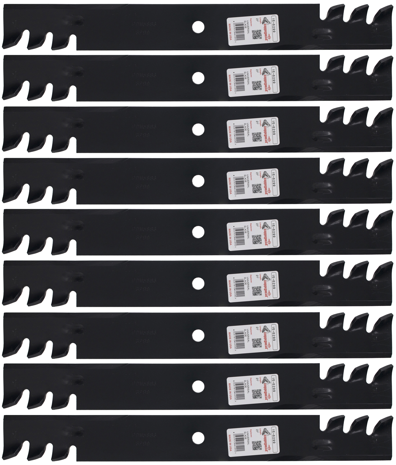 Nine (9) pack of Rotary® 6299 replacement lawn mower blades for Bobcat, Bunton, Encore, Ferris, Giant Vac, Great Dane, Husqvarna, Hustler, Kees, Lastec, Lesco, Ransomes, Scag, Snapper, Snapper Pro, and Wright Mfg. mowers. Requires three (3) blades for 60- and 61-inch decks.