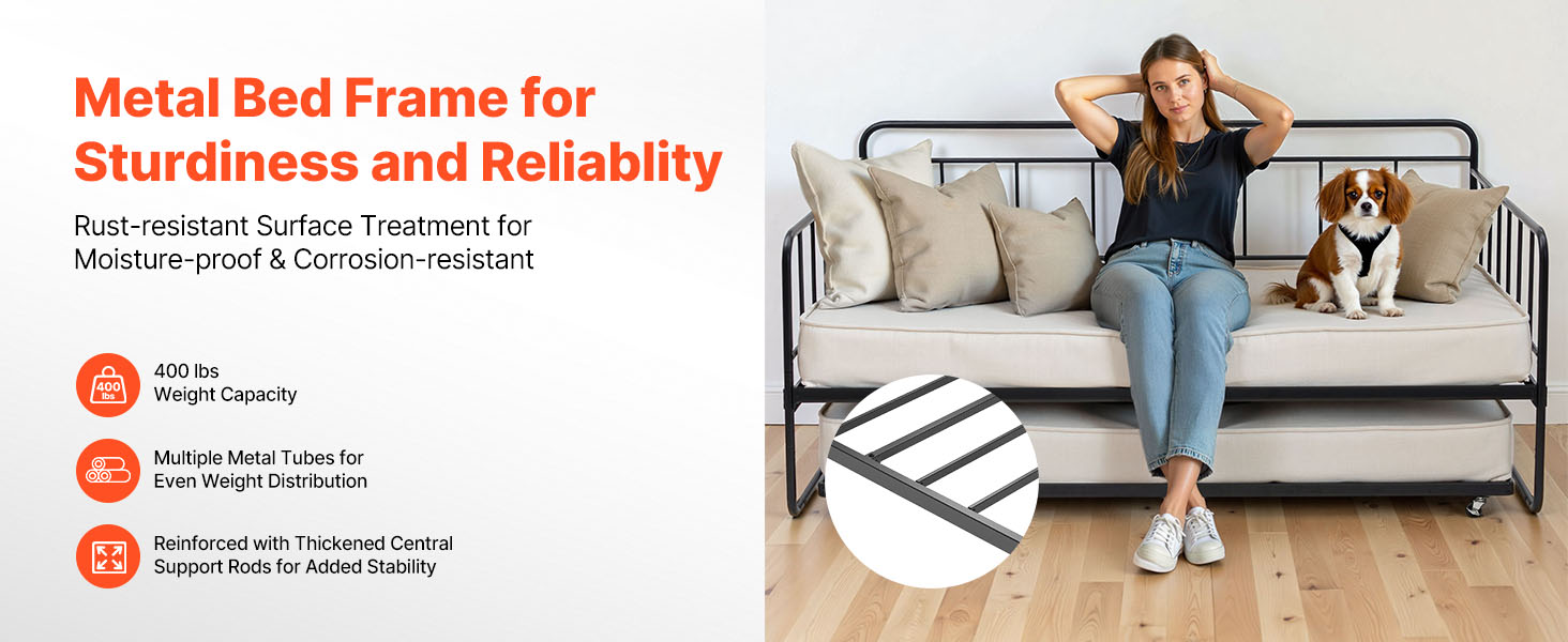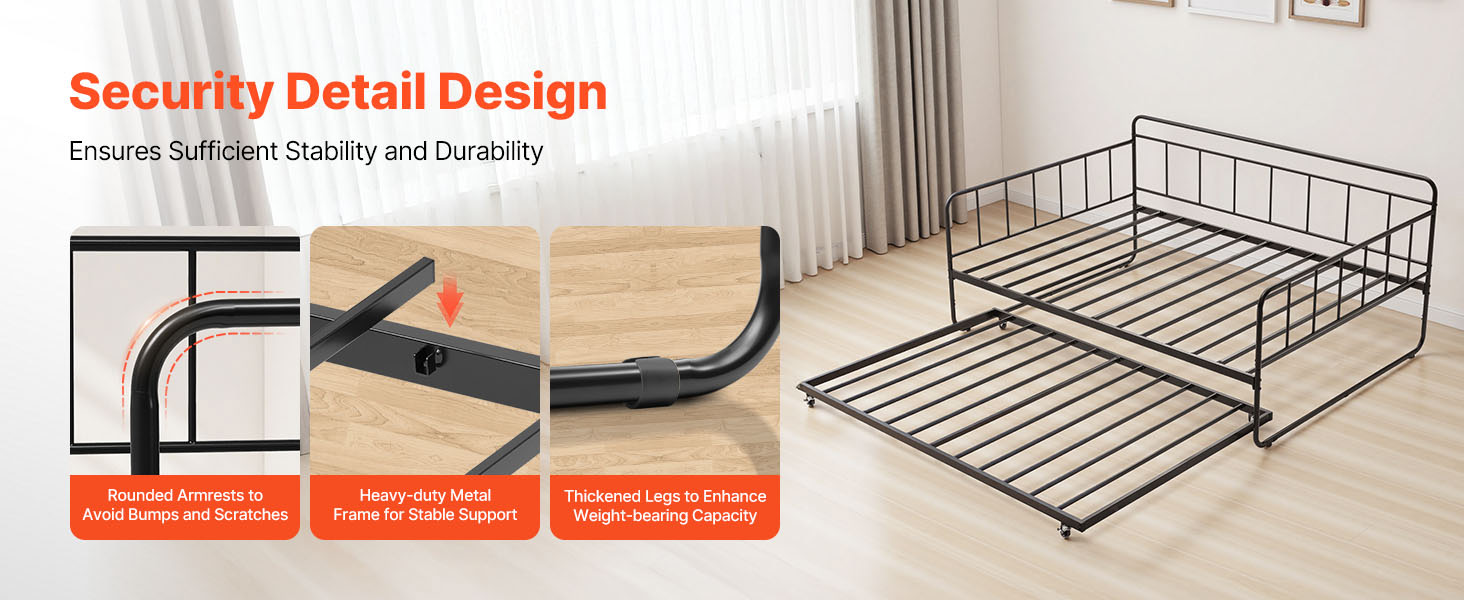 Made with a strong metal frame and tightly connected tube design, this metal daybed can support up to 400 lbs, providing exceptional weight-bearing capacity. It is stable and wobbling- or deformation-resistant, ensuring long-lasting use.