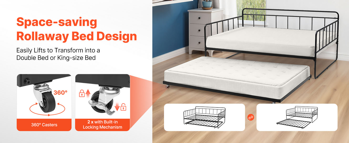 Dual-purpose Daybed: This daybed frame features a movable roller design. When pulled out, it can transform into two single beds or one large bed, turning your living room into a comfortable and practical guest room, providing guests with a warm and cozy sleep space. It is ideal for small apartments, living rooms, home offices, or guest rooms