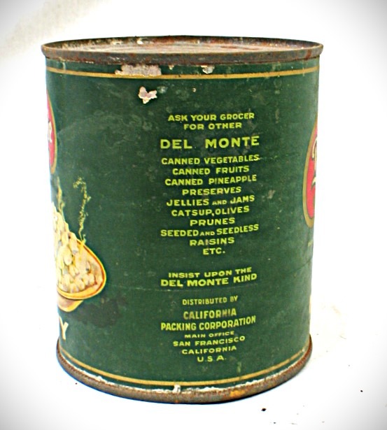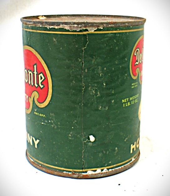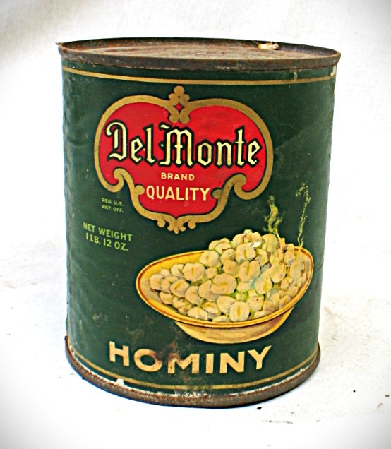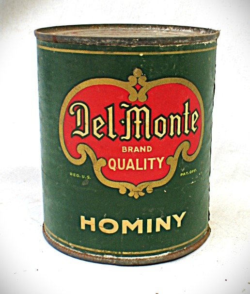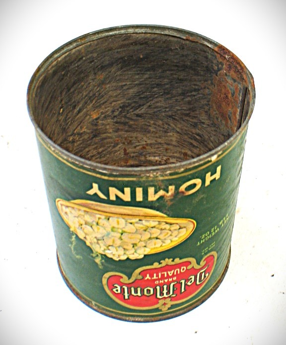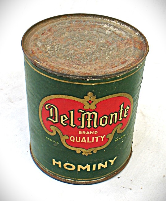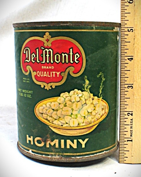 Vintage Old Tin Can with Paper Label Del Monte Hominy... It was opened on the bottom... Good condition, please see photos for details... Measures 5 inches tall...