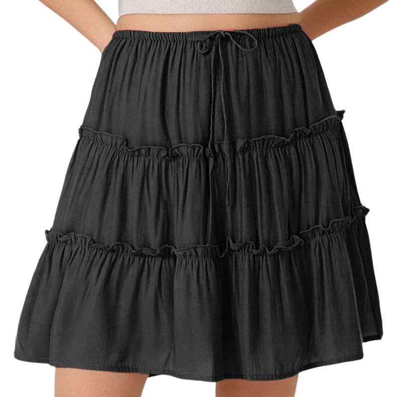 Women Girls Solid Lining A-line Ruffled Short High Waist Beach Mini Skirt Daily
