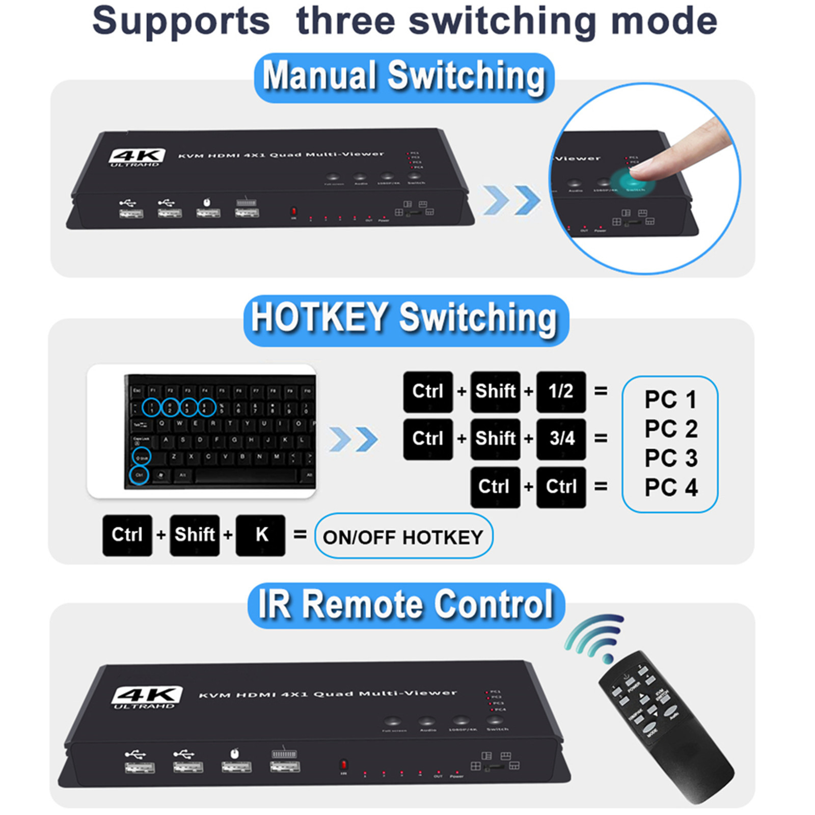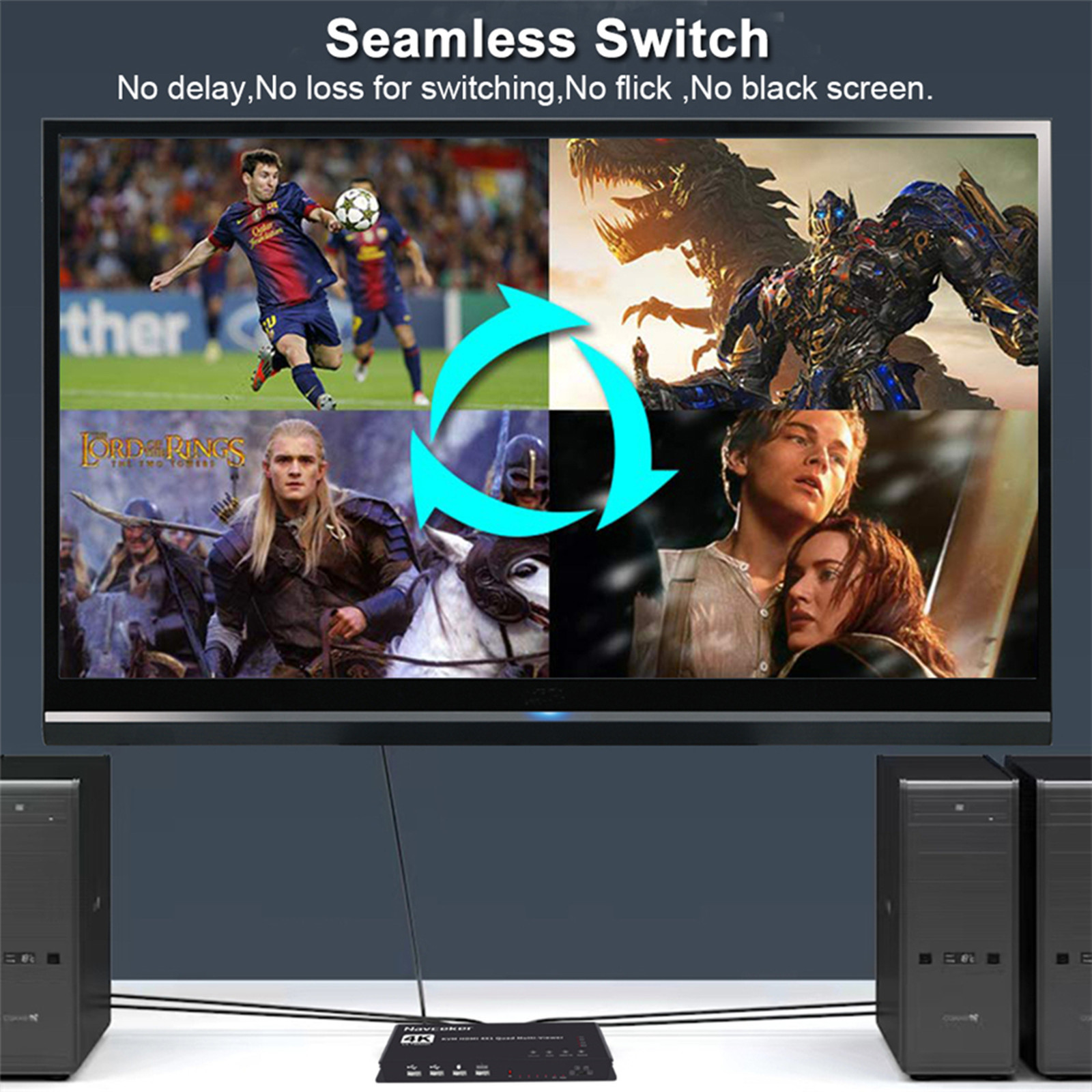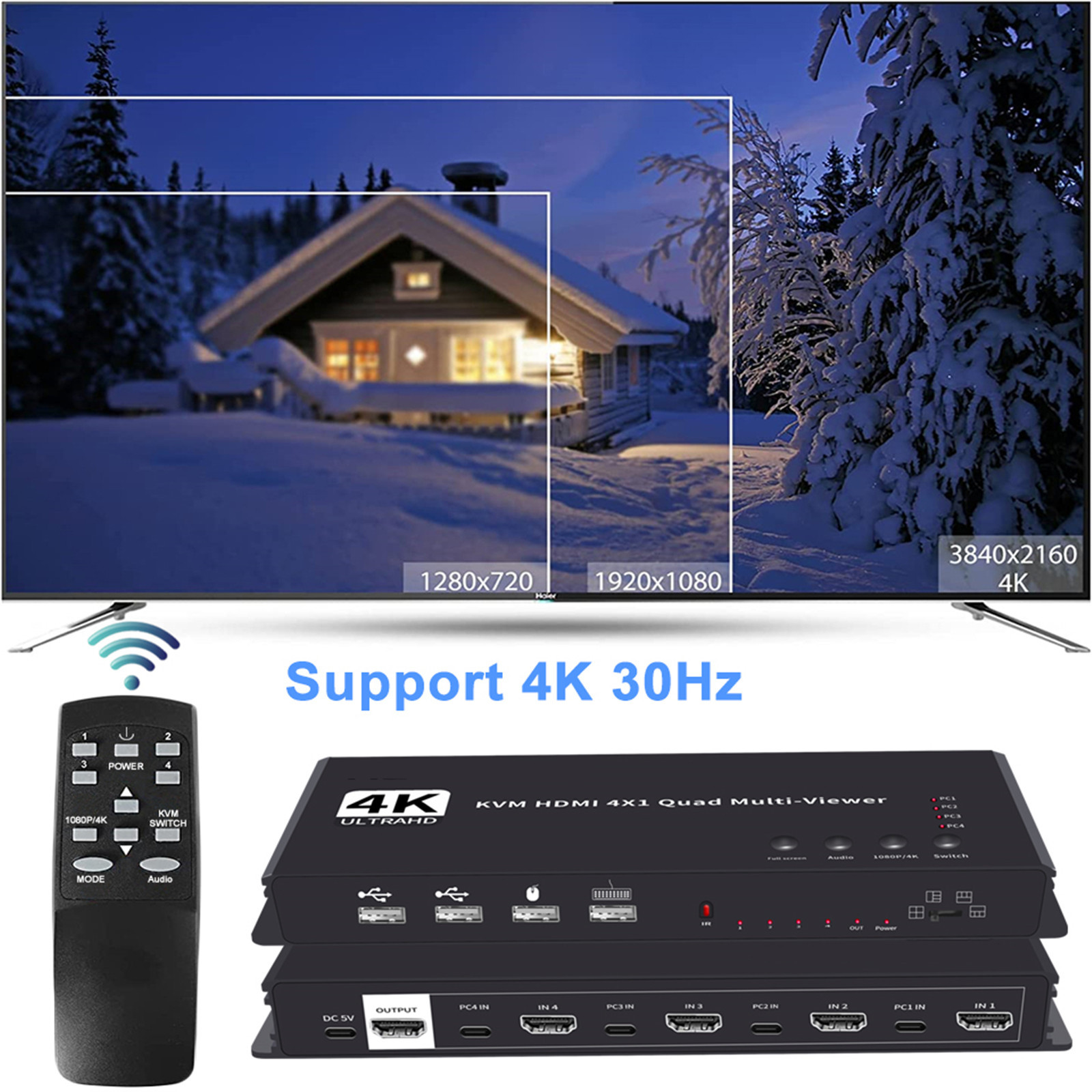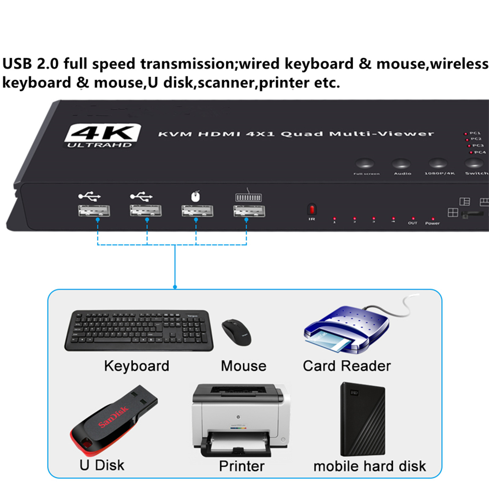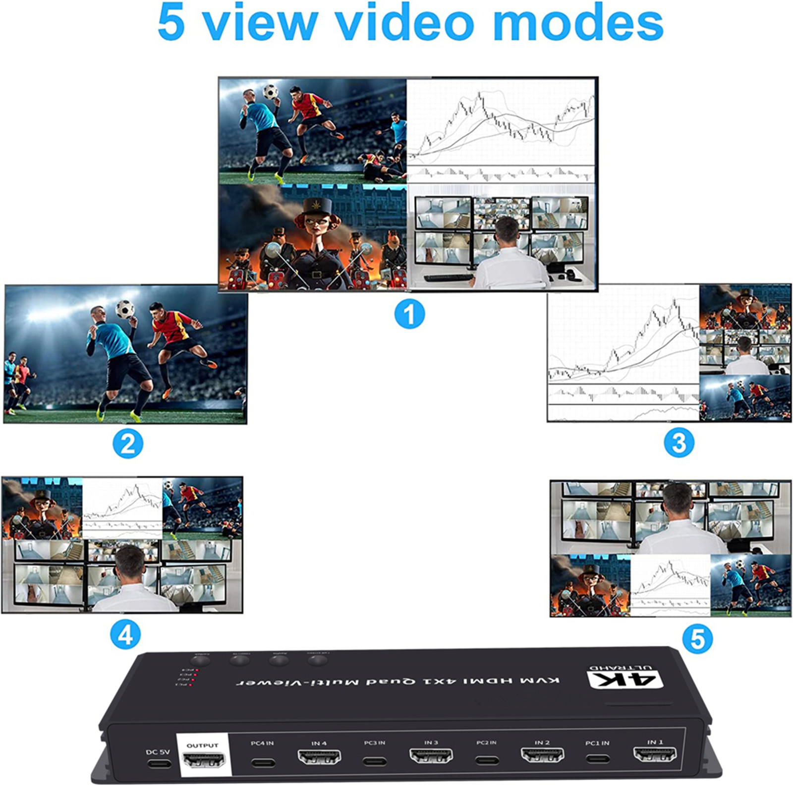 4K 4 In 1 out KVM HDMI 4X1 Quad Multi-viewer HDMI Quad Screen Segmentation Multiviewer a with Keyboard hotkey
