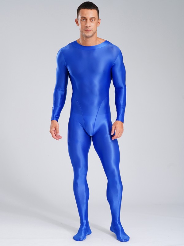 A full body jumpsuit for men, designed with mock neck, long sleeve, back zipper closure, stretchy to fit.