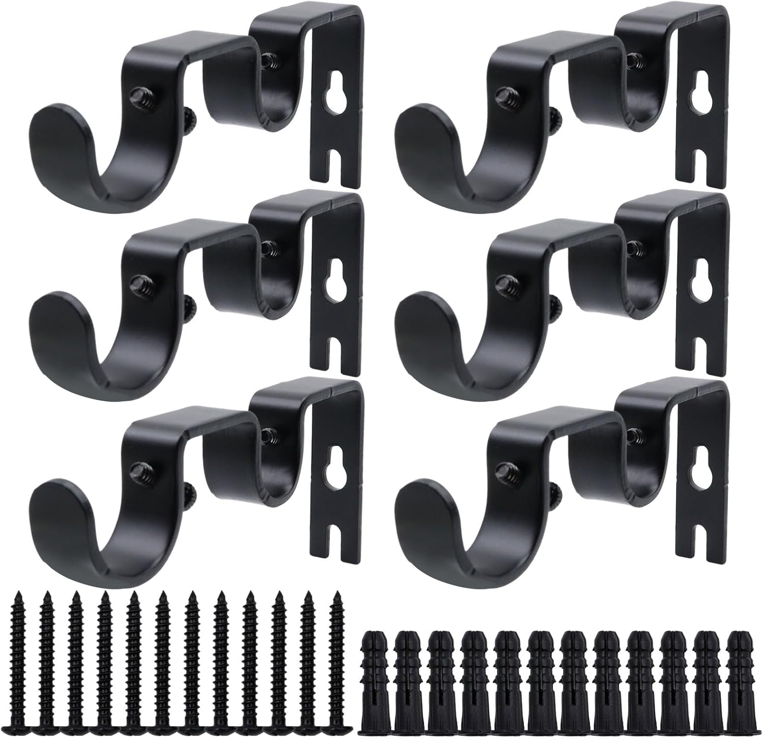 Descriptions:Simple & classic style double curtain rod holder not only supports your curtains and curtain rods well, but also matches perfectly with your other room set. Add the finishing touch to your window treatments while creating an element of elegance to your multifunctional rod bracket not only can be used as curtain rod bracket, but also can be used as room dividing curtain pole holders, shower rod hook and so on; Perfect for using in bedroom, living room, bathroom, front porch, patio, and also could be suitable for office, hotel and other commercial places and occasions.Sturdy wall mounted curtain rod bracket internal diameter is 1 inch/2.5 cm, it's compatable with a wide range of curatin rod and suitable for a rod diamater size of 1 inch. Warm Tip: Please measure your curtain rod size before rod bracket for curtain rod is made from premium quality metal with good workmanship, it's solid and capable of supporting heavy curtain rod and curtain. And the surface coated with a nice black finish for decorating and lasting package of this curtain rod holder comes with all the hardware needed for mounting on the wall. It's also very easy to installSpecification:Mounting Type: Wall MountedColor: BlackMaterial: MetalPackage:6 x Double Curtain Rod Hooks12 x Screws12 x Anchors