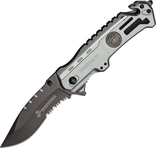 4 3/4" closed linerlock. 3 1/4" black finish stainless assisted opening partially serrated drop point blade with dual thumb studs and extended tang. Silver finish aluminum handles with black trim and integrated seat belt cutter and glass breaker. Handle is etched Semper Fi and has Marine inlay shield. Black finish stainless pocket clip.