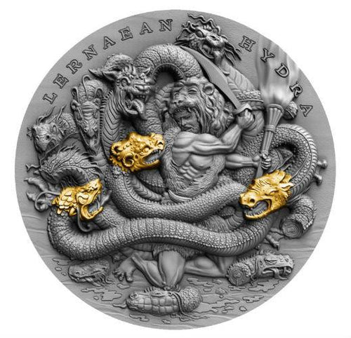LERNAEAN HYDRA Twelve Labours of Hercules 2 Oz Silver coin is the second release in the “Twelve Labours of Hercules” series, dedicated to one of the Twelve Labours – Lernaean Hydra. The coin features an incredible Gold plating, has a great High Relief, has an Antique Finish quality and comes in a themed case, along with the Certificate of Authenticity. Limited mintage to only 500 pieces worldwide!