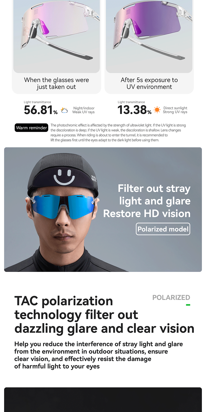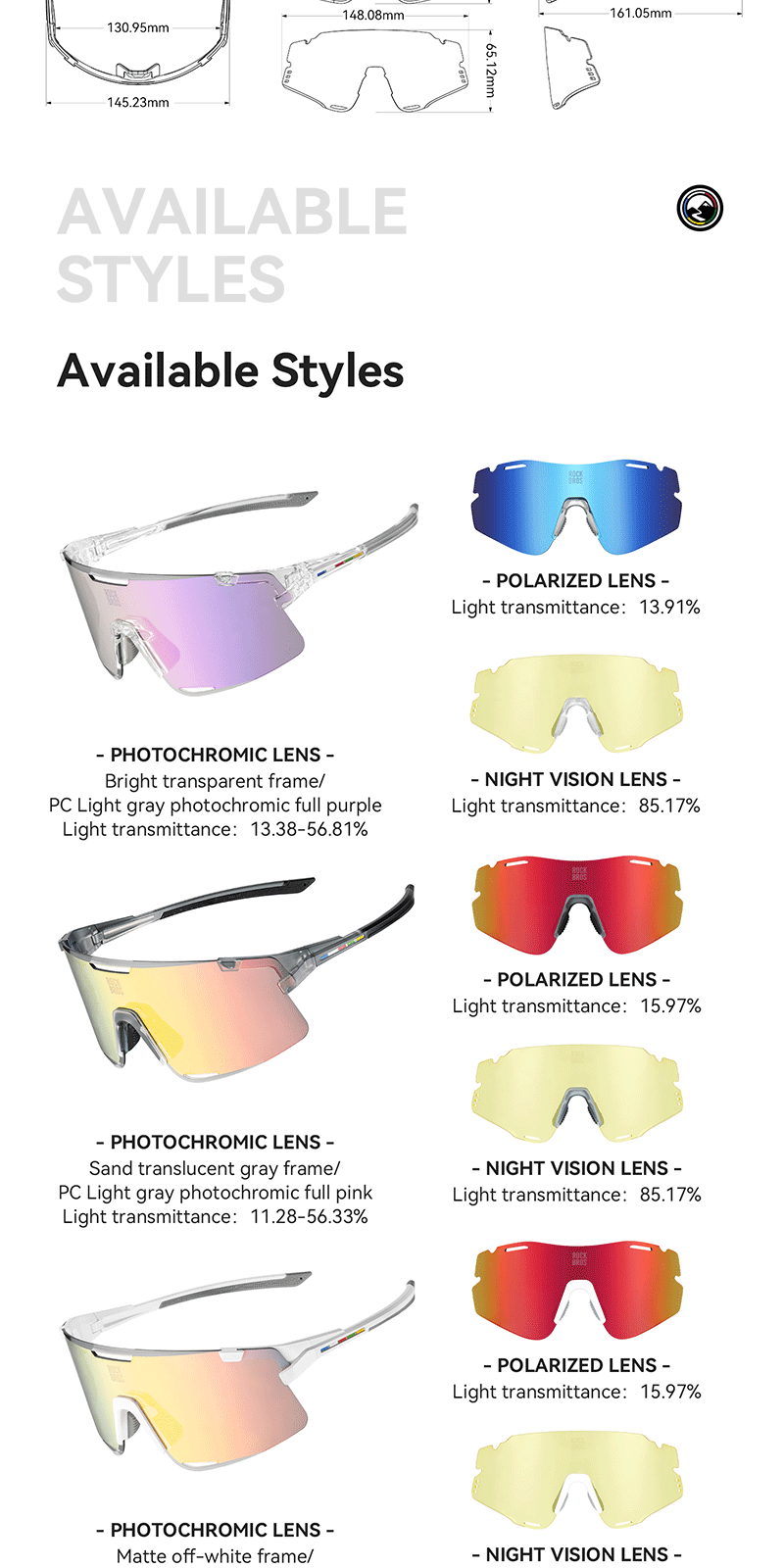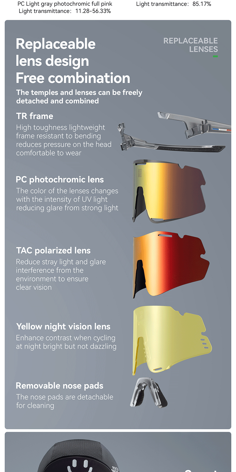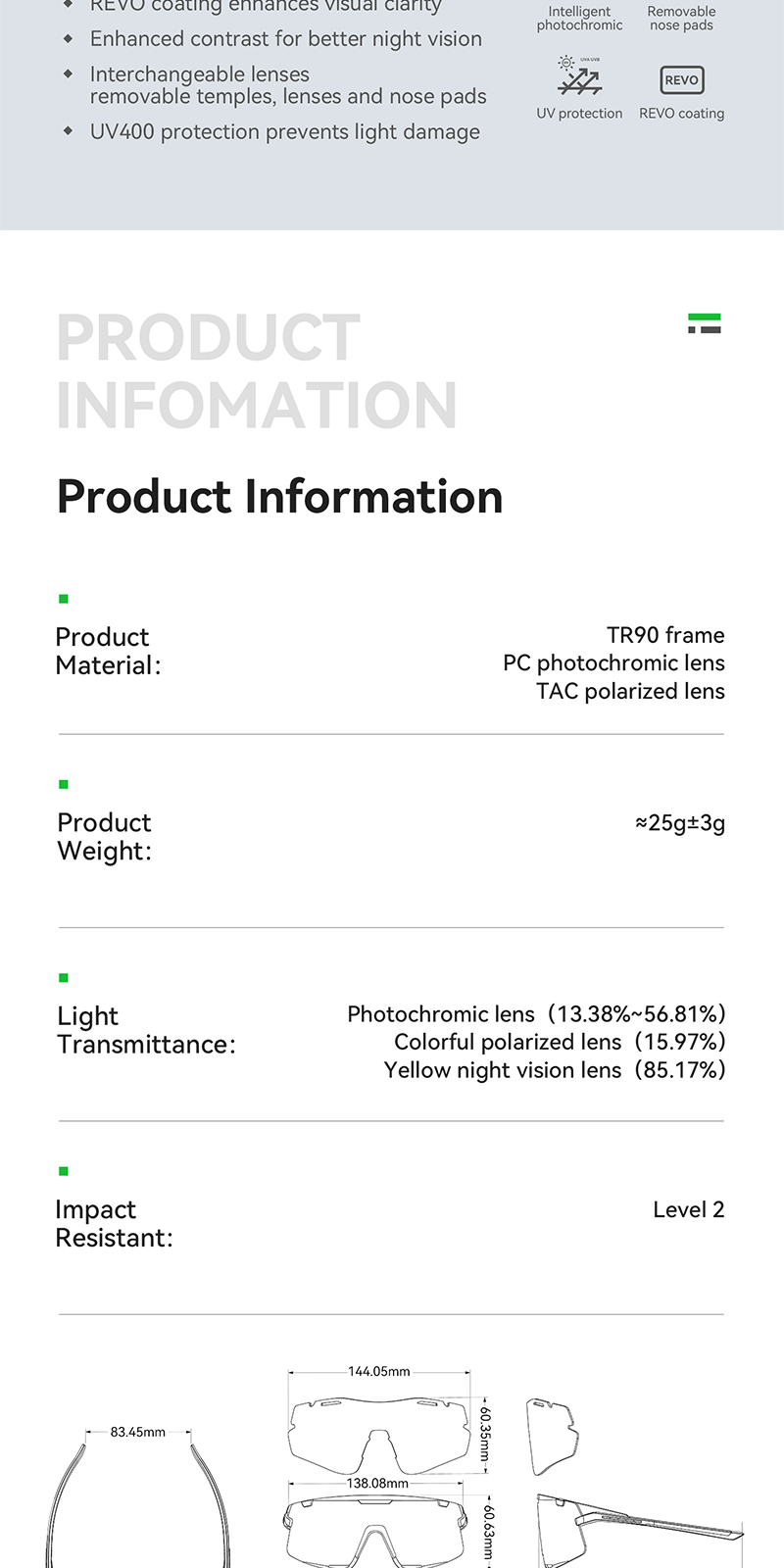 1.Product Material: TR90 frame PC photochromic lens TAC polarized lens 2.Product Weight: About 25g±3g 3.Light Transmittance: Photochromic lens(13.38%~56.81%) Colorful polarized lens(15.97%) Yellow night vision lens(85.17%) 4.Impact Resistant: Level 2 1. All-weather intelligent photochromic 2. REVO coating enhances visual clarity 3. Enhanced contrast for better night vision 4. Interchangeable lenses 5. removable temples, lenses and nose pads 6. UV400 protection prevents light damage Replaceable lens design Free combination The temples and lenses can be freely detached and combined TR frame High toughness lightweight frame resistant to bending, reduces pressure on the head, comfortable to wear PC photochromic lens The color of the lenses changes with the intensity of UV light, reducing glare from strong light TAC polarized lens Reduce stray light and glare interference from the environment to ensure clear vision Yellow night vision lens Enhance contrast when cycling at night bright but not dazzling Removable nose pads The nose pads are detachable for cleaning
