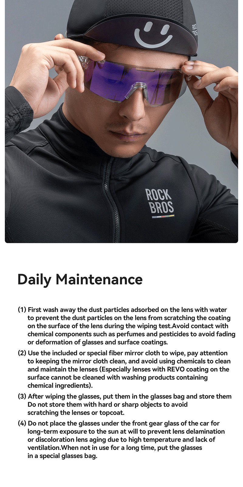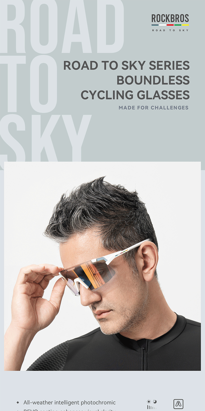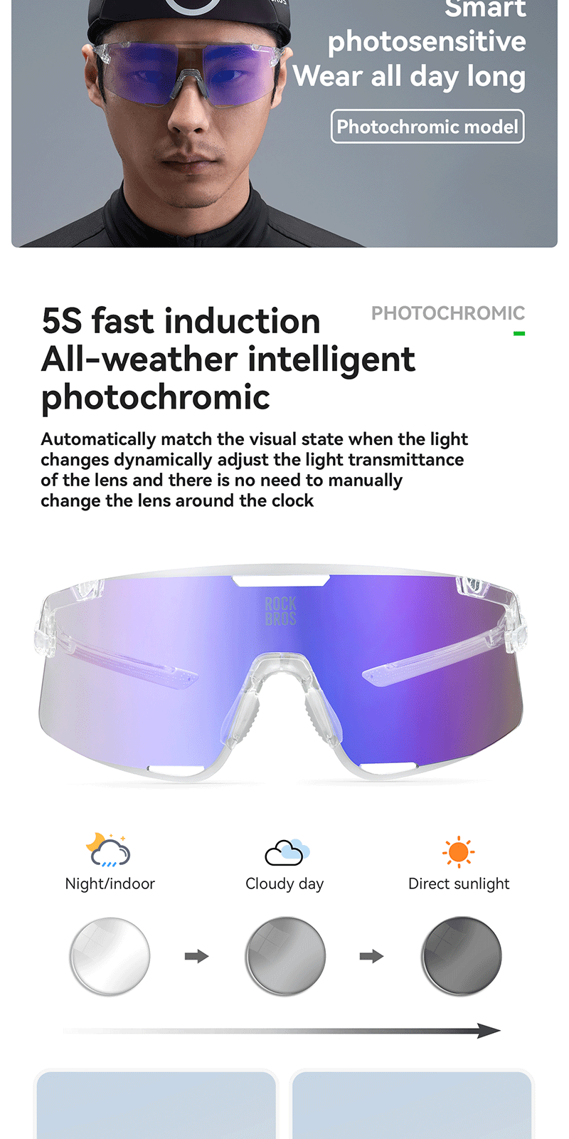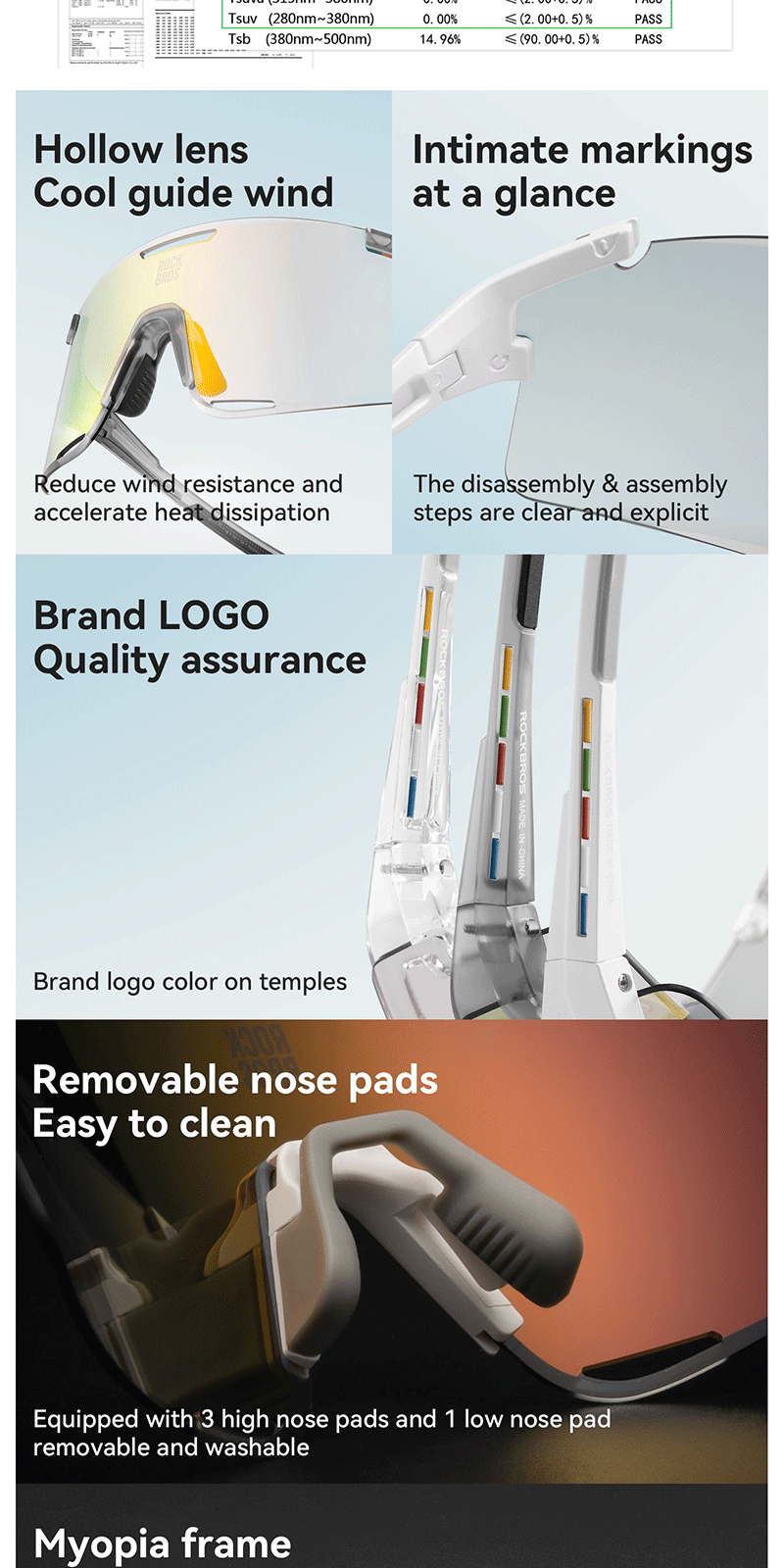 1.Product Material: TR90 frame PC photochromic lens TAC polarized lens 2.Product Weight: About 25g±3g 3.Light Transmittance: Photochromic lens(13.38%~56.81%) Colorful polarized lens(15.97%) Yellow night vision lens(85.17%) 4.Impact Resistant: Level 2 1. All-weather intelligent photochromic 2. REVO coating enhances visual clarity 3. Enhanced contrast for better night vision 4. Interchangeable lenses 5. removable temples, lenses and nose pads 6. UV400 protection prevents light damage Replaceable lens design Free combination The temples and lenses can be freely detached and combined TR frame High toughness lightweight frame resistant to bending, reduces pressure on the head, comfortable to wear PC photochromic lens The color of the lenses changes with the intensity of UV light, reducing glare from strong light TAC polarized lens Reduce stray light and glare interference from the environment to ensure clear vision Yellow night vision lens Enhance contrast when cycling at night bright but not dazzling Removable nose pads The nose pads are detachable for cleaning