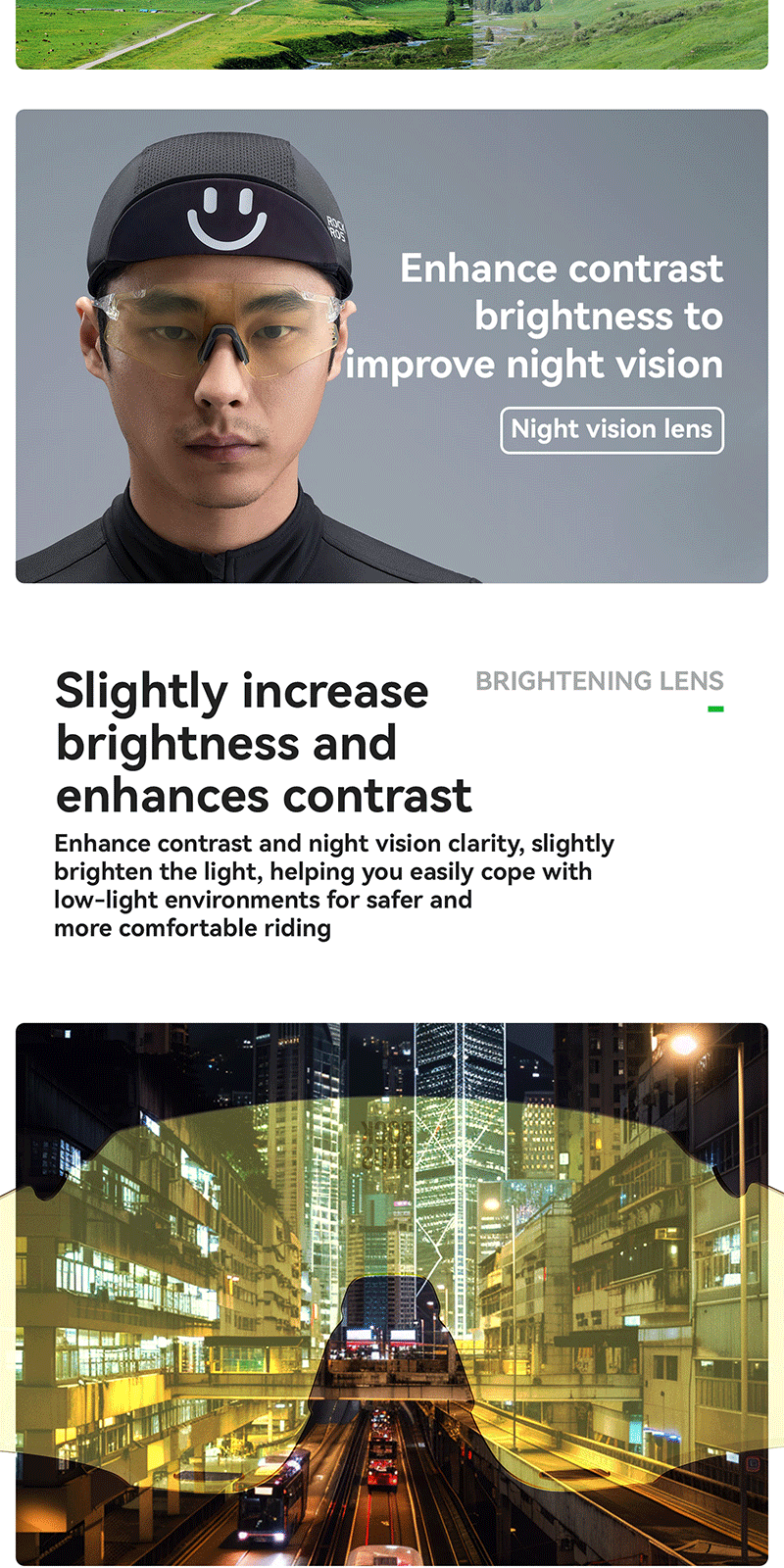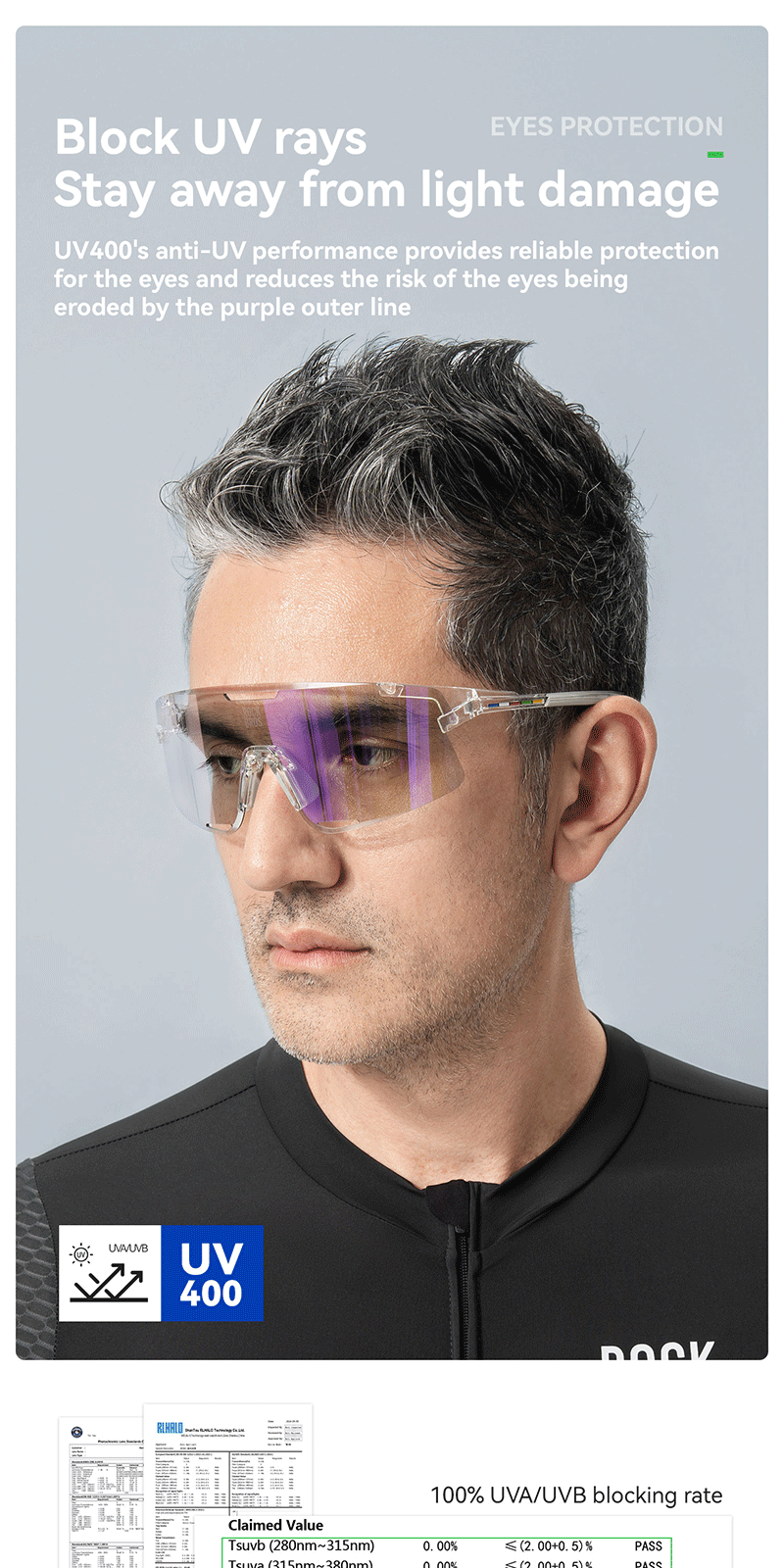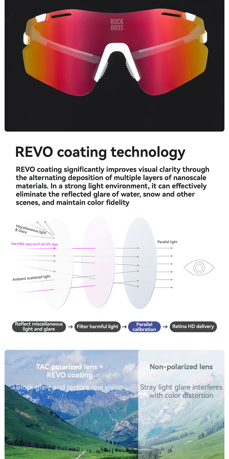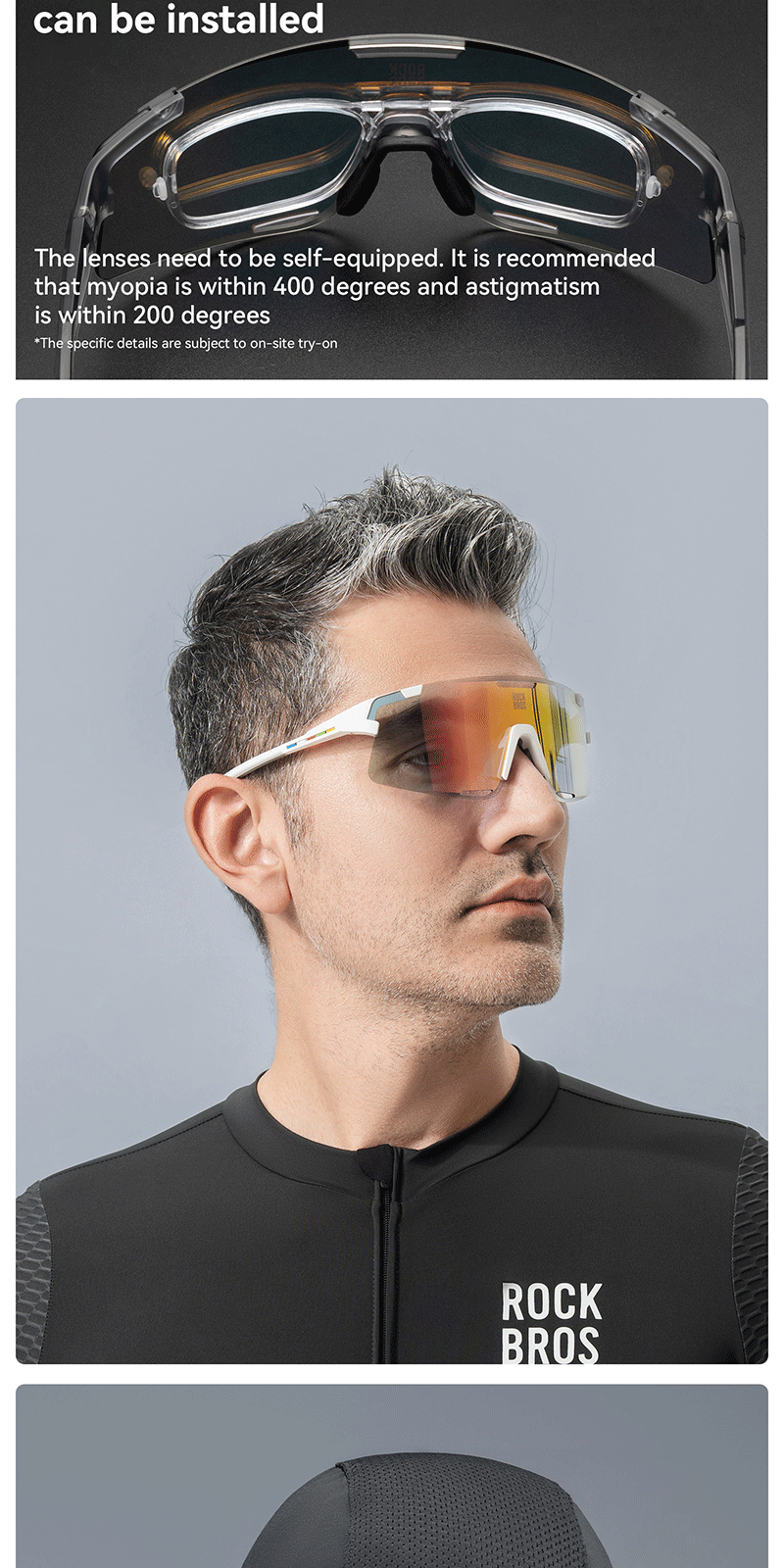 1.Product Material: TR90 frame PC photochromic lens TAC polarized lens 2.Product Weight: About 25g±3g 3.Light Transmittance: Photochromic lens(13.38%~56.81%) Colorful polarized lens(15.97%) Yellow night vision lens(85.17%) 4.Impact Resistant: Level 2 1. All-weather intelligent photochromic 2. REVO coating enhances visual clarity 3. Enhanced contrast for better night vision 4. Interchangeable lenses 5. removable temples, lenses and nose pads 6. UV400 protection prevents light damage Replaceable lens design Free combination The temples and lenses can be freely detached and combined TR frame High toughness lightweight frame resistant to bending, reduces pressure on the head, comfortable to wear PC photochromic lens The color of the lenses changes with the intensity of UV light, reducing glare from strong light TAC polarized lens Reduce stray light and glare interference from the environment to ensure clear vision Yellow night vision lens Enhance contrast when cycling at night bright but not dazzling Removable nose pads The nose pads are detachable for cleaning
