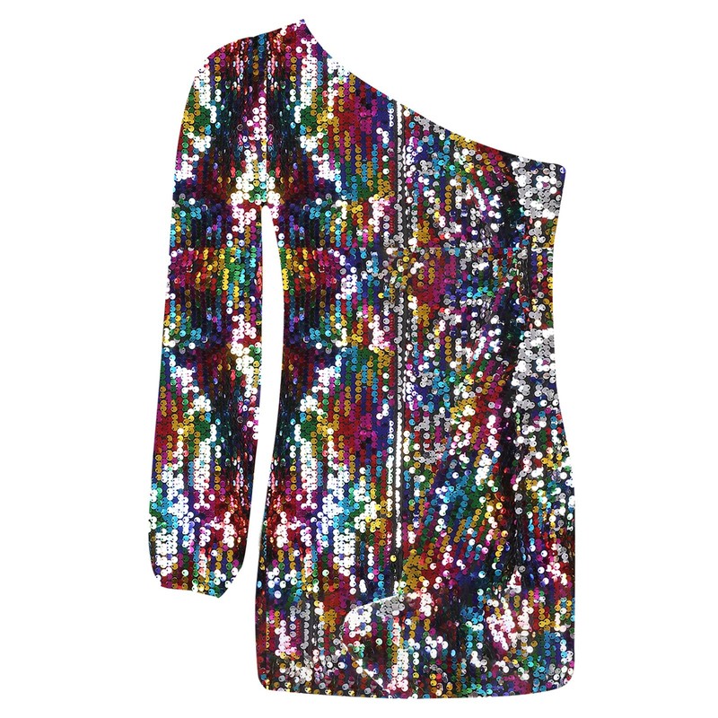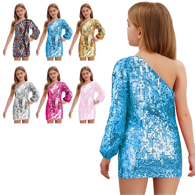 Girls One Shoulder Dress Long Sleeve Above Knee Sequins Birthday Pageant Wedding