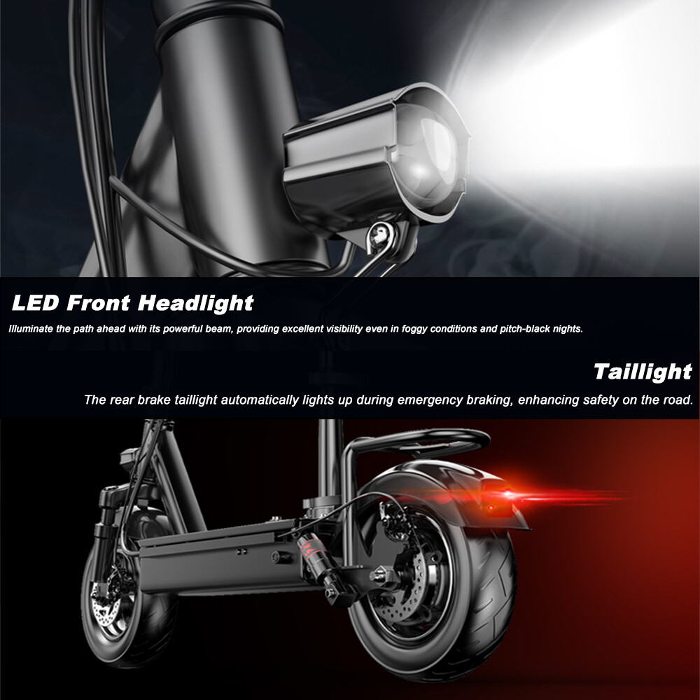 Front headlight offers great visibility in low light or fog. Rear brake light enhances safety during sudden stops.