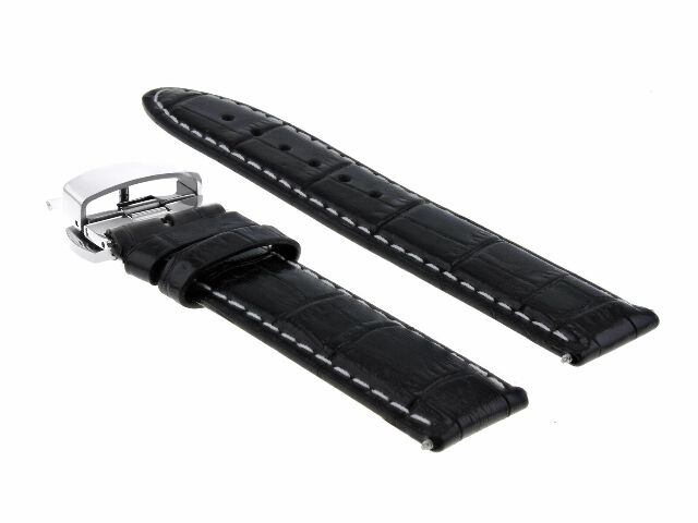 The strap is made from high-grade Italian Genuine calfskin leather for a deep black color and durability. The underside is lined with soft beige nubuck leather for comfort and sweat resistance. The strap thickness is 5mm at the lugs and 2.5mm at the clasp. The total length is 115mm for the long part and 75mm for the short part. The deployment butterfly clasp is constructed from 316L stainless steel.