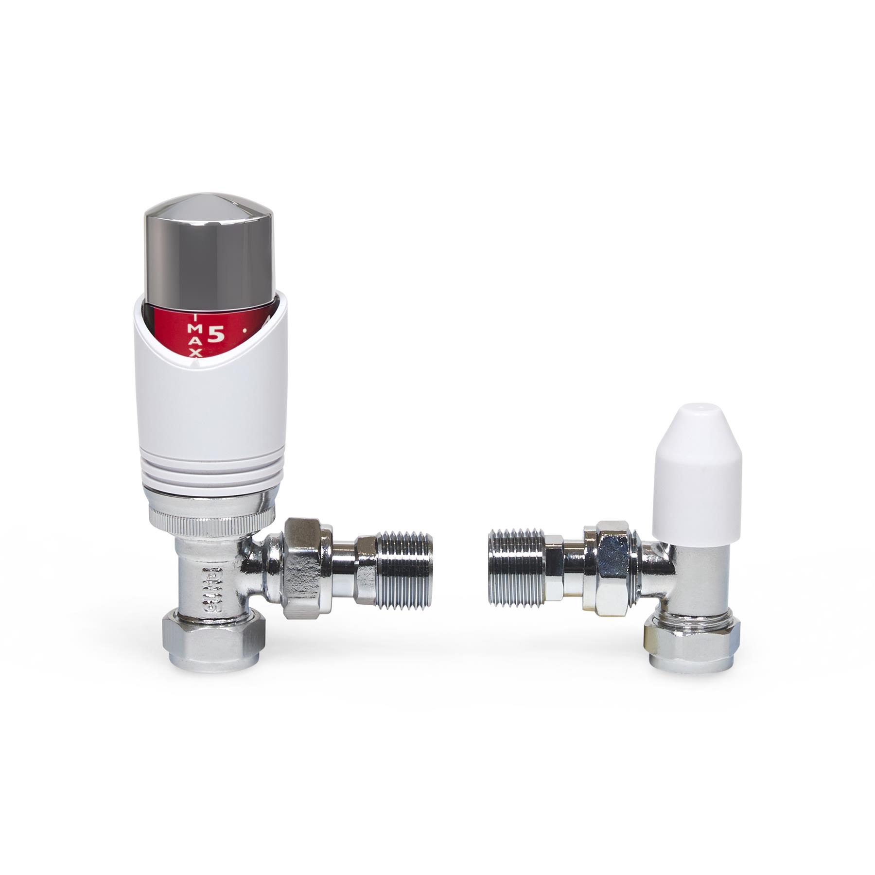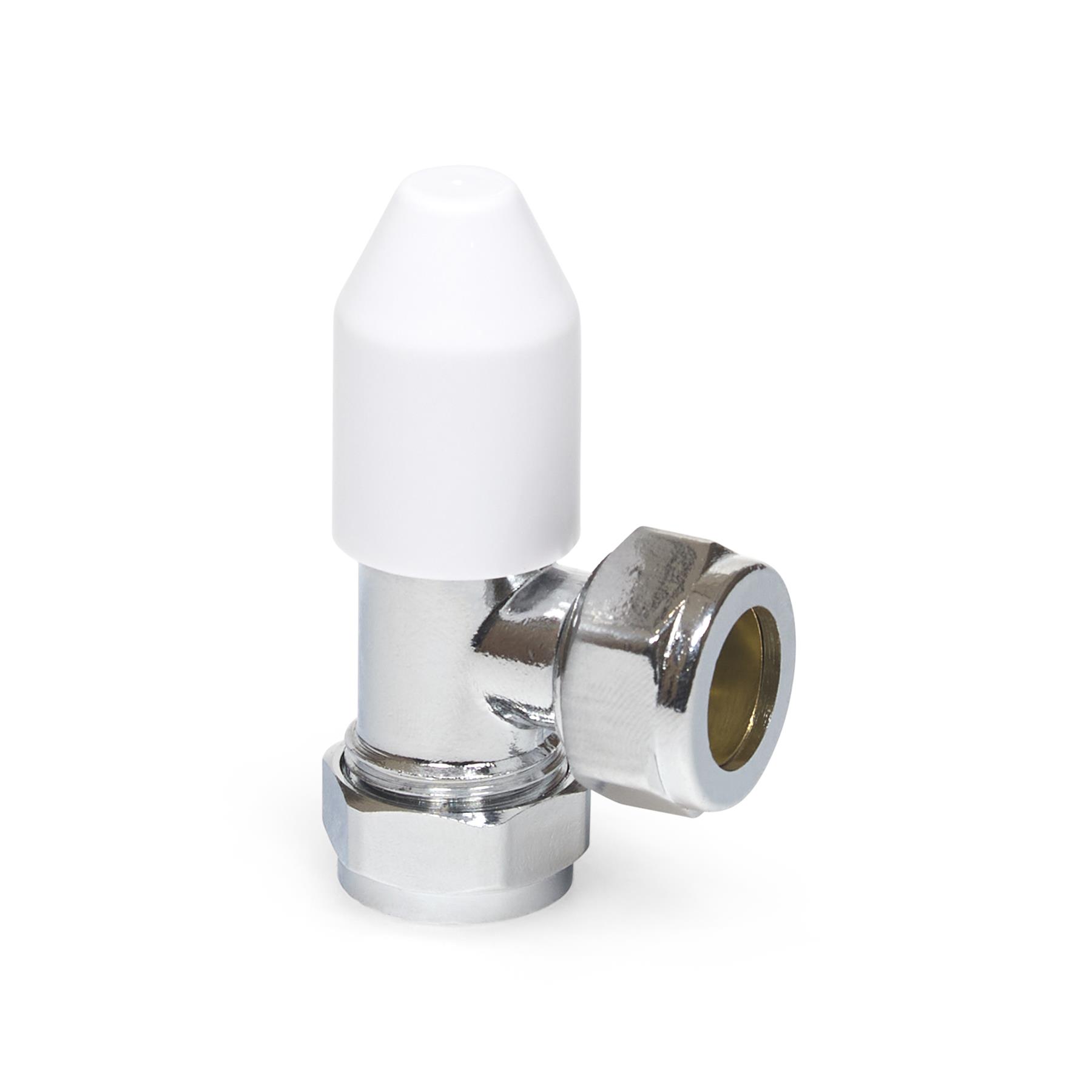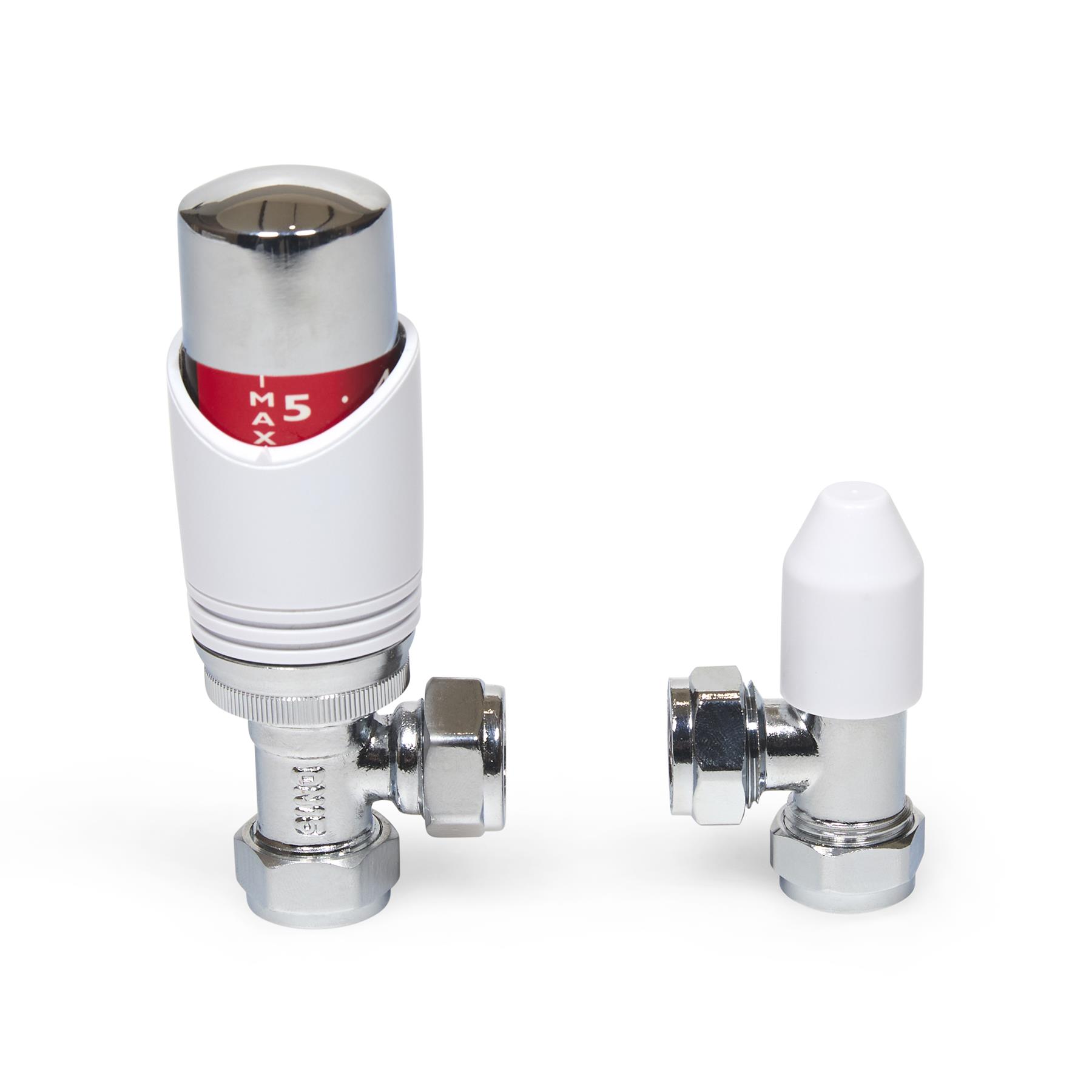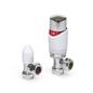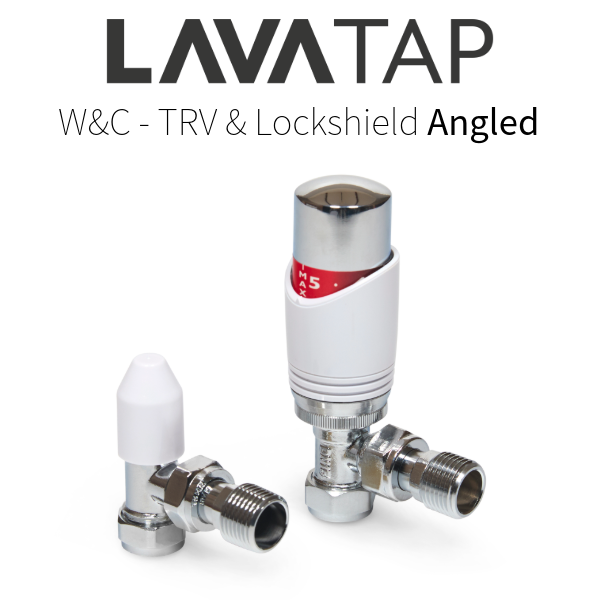 The LavaTap – Designer White & Chrome Angled Thermostatic Radiator Valve (TRV) & Lockshield Set offers a stylish and practical upgrade for central heating systems. Finished in polished chrome with a clean white head, it gives radiators a modern, premium look while providing reliable manual heating control. This angled radiator valve set fits 15 mm copper or plastic pipes with ½″ BSP radiator threads, the UK standard. It is not suitable for 8 mm or 10 mm microbore systems, or for radiators that require straight or corner valves without adapters. Checking compatibility before purchase helps avoid incorrect orders and ensures a proper fit. Each pack includes an angled TRV, matching lockshield, radiator tails, compression nuts, and olives – everything needed for a straightforward replacement or installation. The angled design suits radiators with floor pipework connecting into the side. Built from chrome-plated brass with a durable ABS head, this valve set is designed for long service life. By adjusting radiator output and balancing your system, it helps reduce wasted heat, improve efficiency, and cut down on energy bills while adding a sleek designer finish to your home heating.